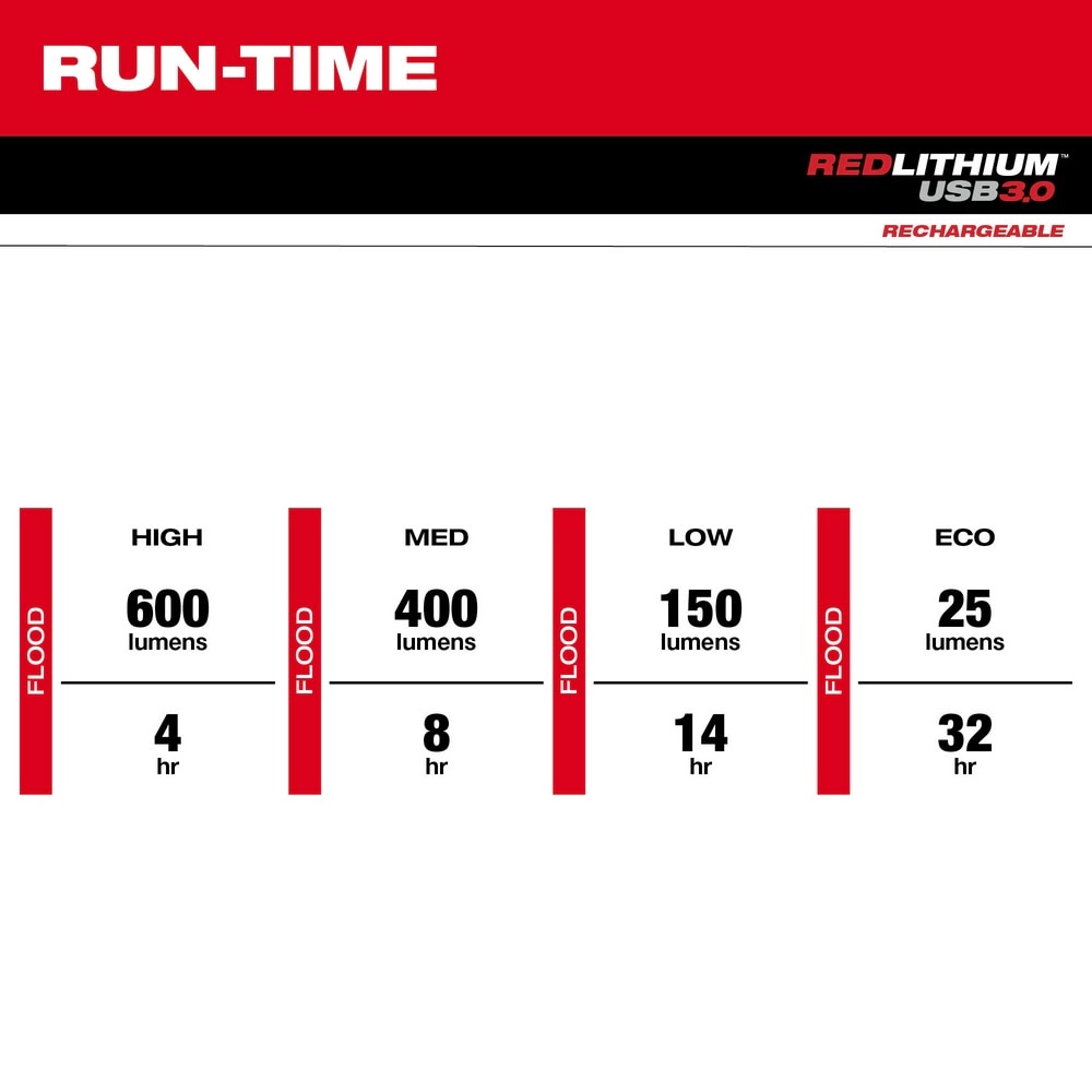- 4 Light Output Modes: Flood High Mode: 600-lumens- 4 hours, Medium Mode: 400 lumens - 8 hours, Low Mode: 150 lumens - 14 hours, ECO Mode: 25 lumens - 32 hours