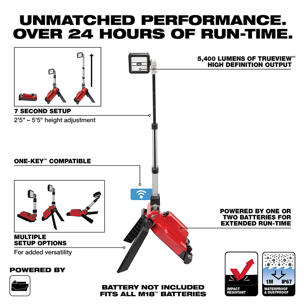 Unmatched Performance, All Day Runtime. The M18 ROCKET Dual Pack Tower Light w/One Key can get light to any environment on any terrain with its 3 leg position options, whether you need quick deployment, or maximum stability, or need to get the light off the ground with its 7 second setup and 5'5 deployment height. It also offers maximum portability with its stowed 22" size perfect for carrying long distances to a scene. Its rotating light head offers 5400 lumens of high output light and can run up to 26 hours with its dual battery design giving users the ability to use one or two M18 batteries. It can withstand the harshest environments with its sealed battery design making it waterproof and dustproof. The Dual Pack Tower Light is One Key capable allowing users to track and set runtimes for unmatched customization. Its high quality LEDs never need to be replaced and are backed by a limited lifetime warranty