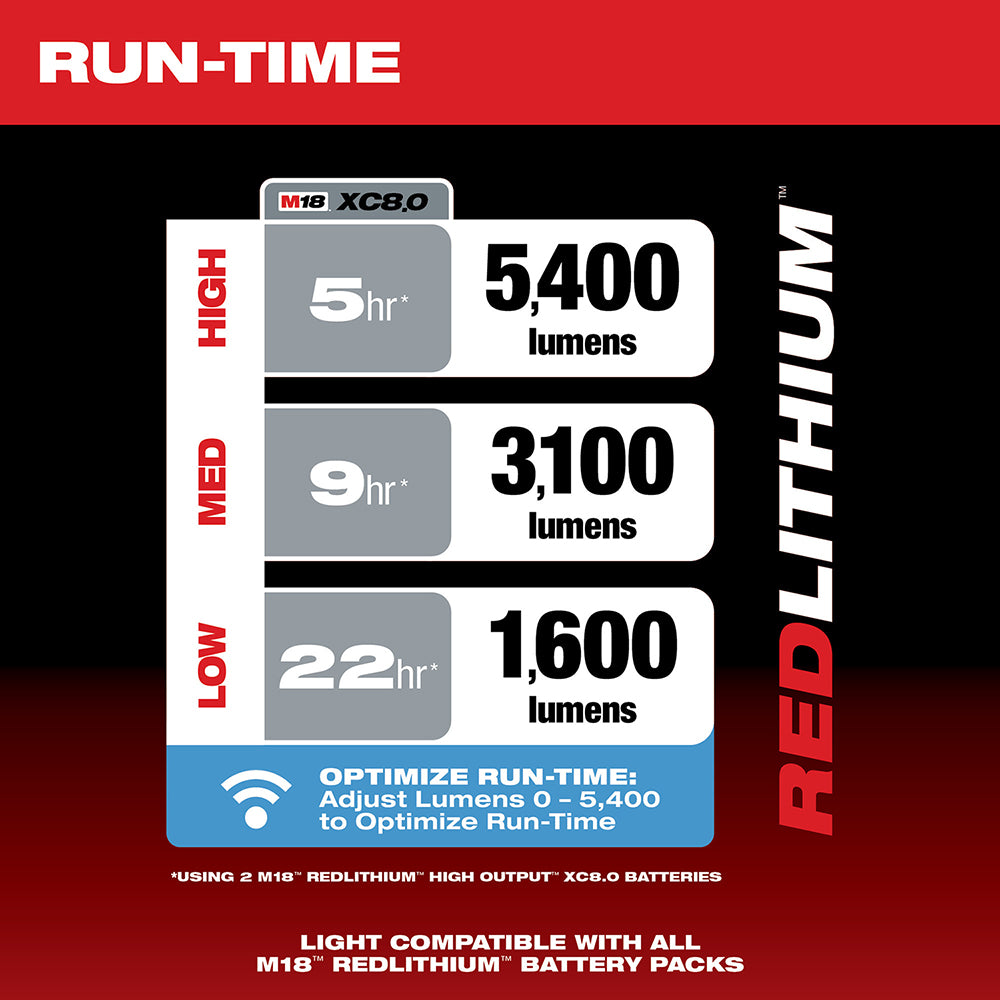 - High mode: 5400 Lumens for up to 7 hours with (2) M18 High Demand 9.0 Batteries