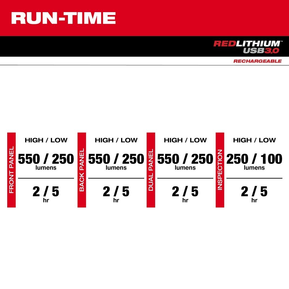 - 2 Hours of Run-time on HIGH on (1) REDLITHIUM™ USB 3.0 Battery
