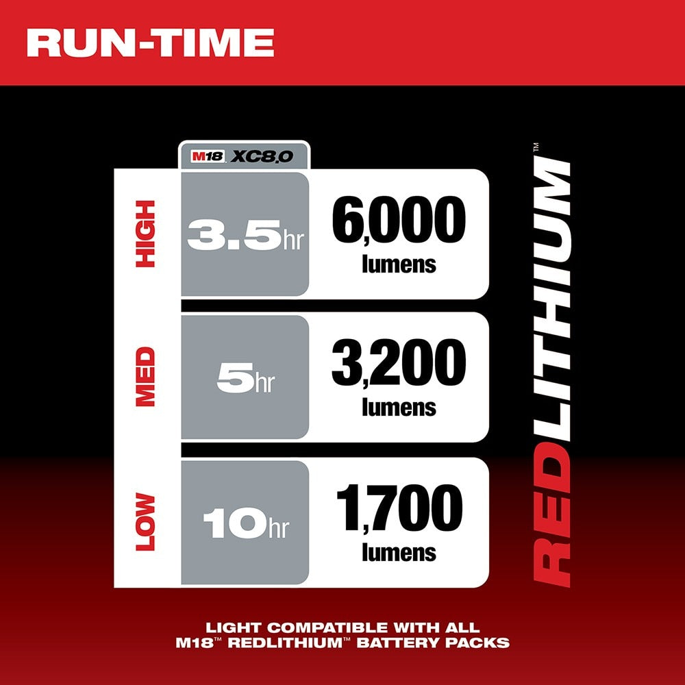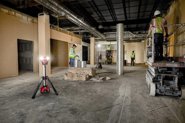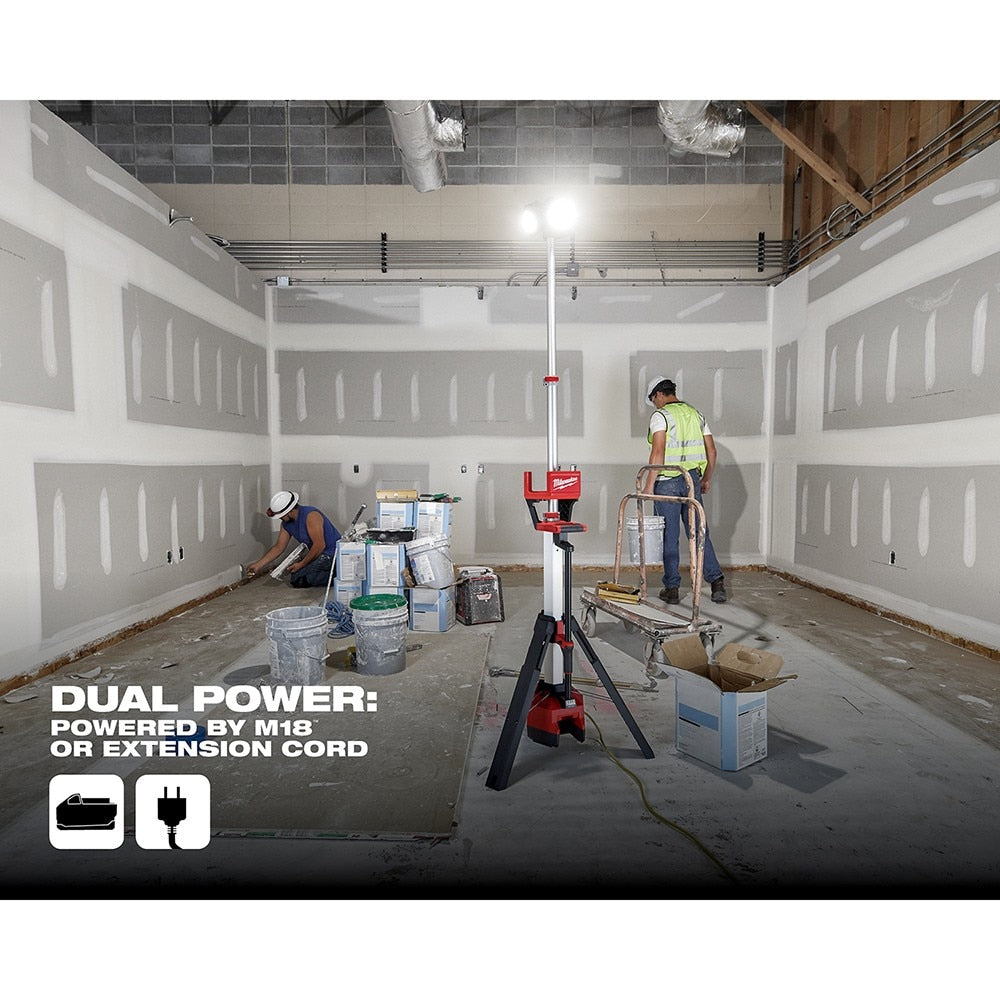 - LED Limited Lifetime Warranty: LEDs never need to be replacedOur M18™ ROCKET™ Tower Light/Charger is designed to deliver you a lighting solution that adapts, performs, and survives to the job site This light tower sets up in seconds to a max height of 7’ and collapses to less than 4’ for easy transportation and storage. The LED light head can be extended from 4-7’ to light overhead work or minimize shadows when casting shine downward. The multidirectional light head allows you to orient the three independently pivoting light heads to cast light in several directions. With an integrated AC plug , you can plug in the light with a standard extension cord and charge any M18™ REDLITHIUM™ pack or use the USB port to charge your devices on site. Delivering 6,000 lumens, it fills up large areas with TRUEVIEW™ High Definition light. For optimized control over the output and run-time, the M18™ ROCKET™ LED Light has three output settings. The LEDs never need to be replaced and are backed by a limited lifetime warranty.