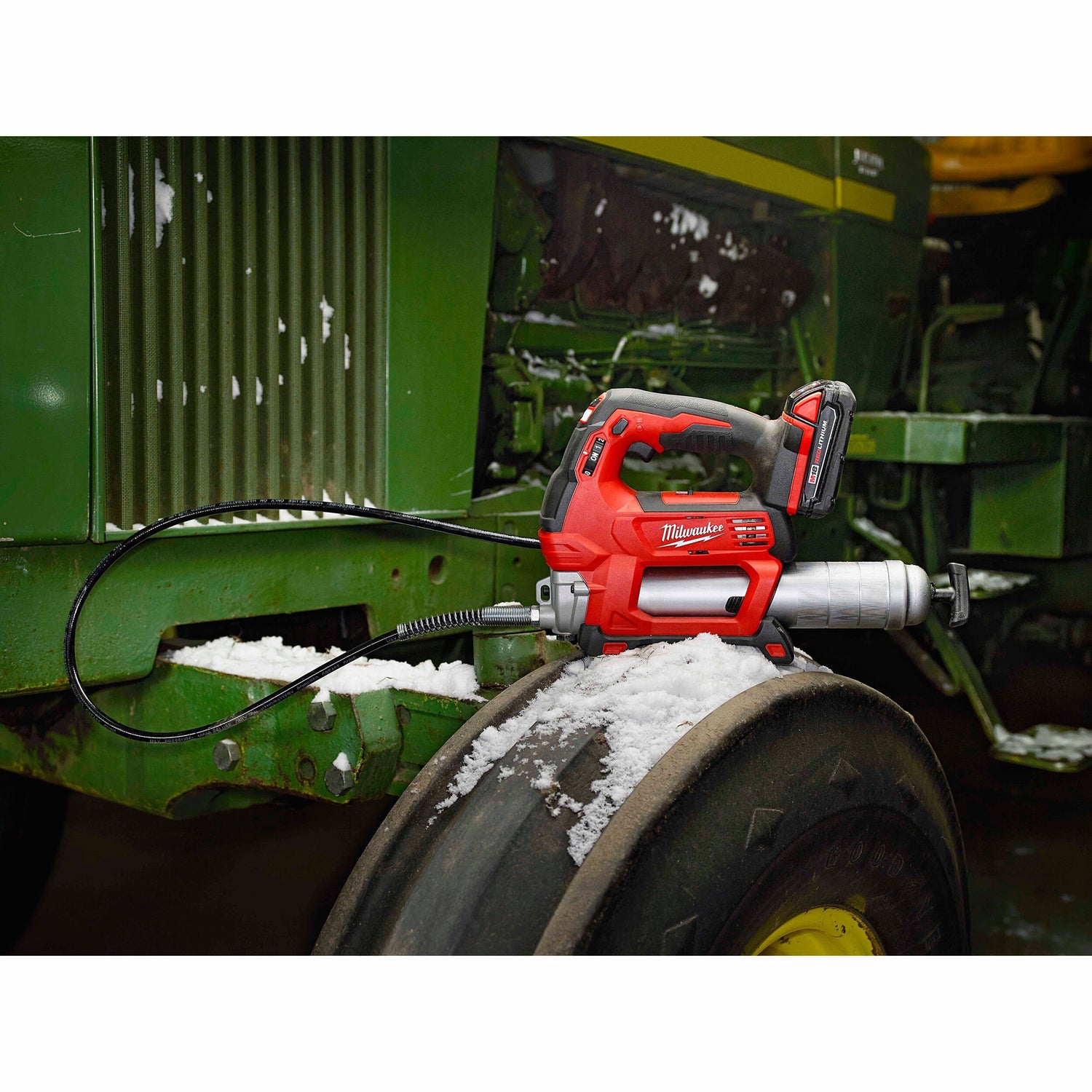 The M18™ Cordless 2-Speed Grease Gun delivers maximum pressure and unmatched versatility, offering an industry leading 10,000 PSI max operating pressure and a patent pending pre-set grease counter that allows service and maintenance professionals to dispense precise amounts of grease. The tool’s 2-speed design offers users the ability to select between max pressure and max flow rate. Other unique features include an on-board LED light, a lock-on/lock-off trigger, and a plunger rod with markings to gauge how much grease is left in the barrel. The tool’s stand up design and shoulder strap capability offer user convenience, while limiting fatigue and the 48” flexible hose offers greater accessibility when greasing hard to reach fittings. The new tool is also compatible with a clear barrel accessory (49-19-2646). Powered by an M18™ REDLITHIUM™ Battery pack, this is the industry’s only 18V grease gun that’s battery is compatible with a system of tools. The kit includes the new multi-voltage charger, so you can charge all M12 and M18 lithium-ion batteries with one charger.