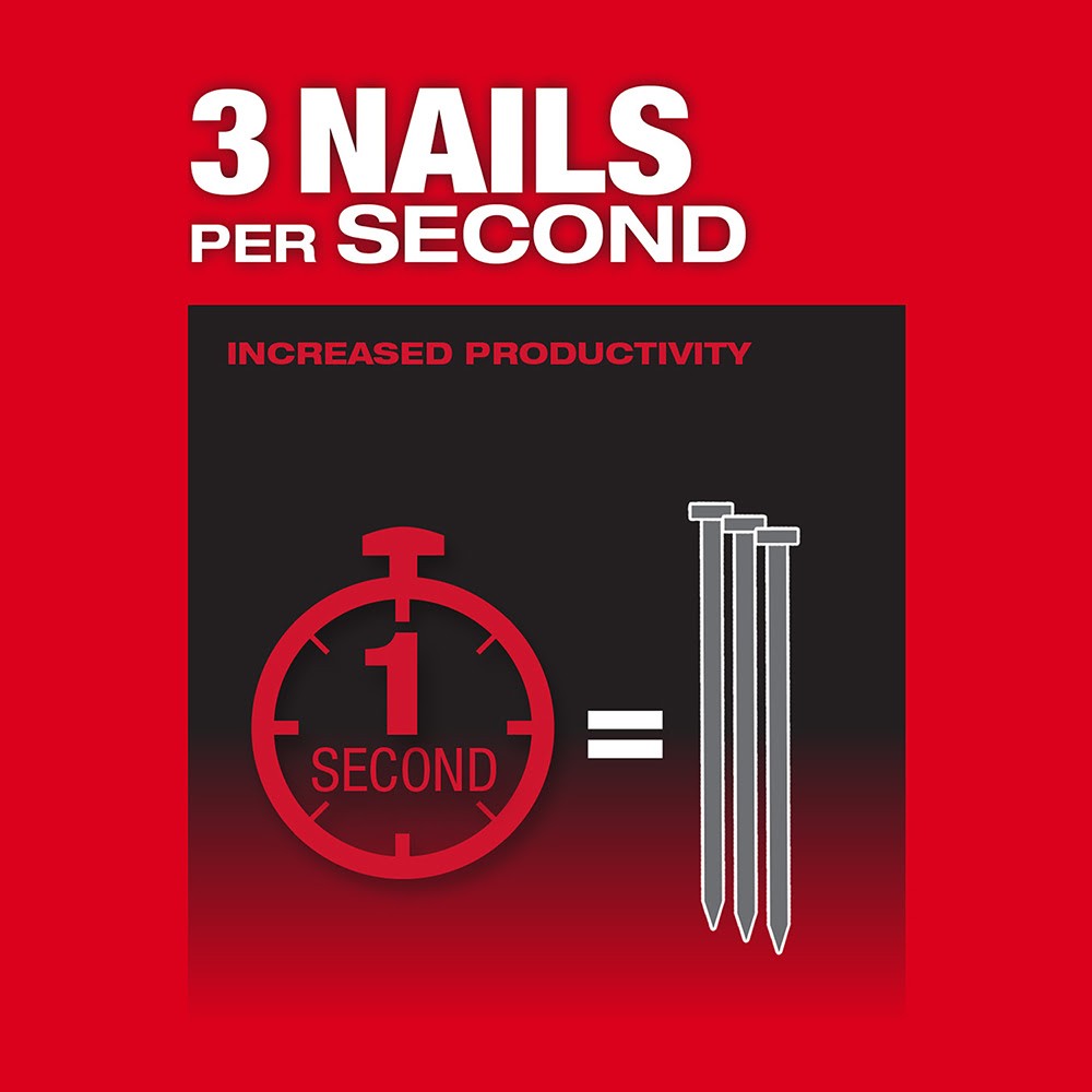 The MILWAUKEE® M18 FUEL™ 21 Degree Framing Nailer Kit sets the new standard for cordless framing nailers.The nitrogen spring mechanism, POWERSTATE™ brushless motor, and REDLINK™ Intelligence delivers pneumatic performance and cordless convenience. The framing nailer can sink full round head nails into dense engineered lumber to tackle the most demanding framing applications. To increase productivity and efficiency, the framing gun fires 3 nails per second with zero ramp-up time, firing a nail as soon as the trigger is pulled. The cordless framing nailer uses only Milwaukee's REDLITHIUM™ Batteries and sealed compressed nitrogen to drive each nail, eliminating the cost of gas cartridges and associated maintenance. The M18 FUEL™ 21 Degree Framing Nailer delivers pneumatic performance and durability that professional carpenters and remodelers expect, without the hassle of a compressor and hose or gas cartridge. This kit includes one M18™ REDLITHIUM™ XC5.0 battery pack, an M18™ & M12™ Multi-Voltage Charger, a rafter hook, non-marring tip, and a contractor bag.