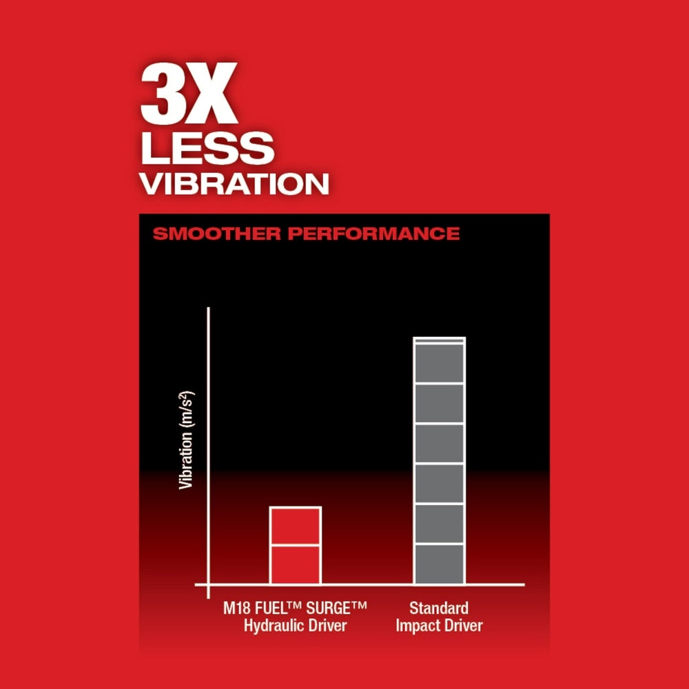 The M18 FUEL™ SURGE™ 1/4" Hex Hydraulic Driver is the quietest cordless fastening solution on the market. With Milwaukee's new FLUID-DRIVE™ Hydraulic Powertrain, users will experience up to 50% quieter operation, 3X less vibration for smoother operation, and faster driving speeds compared to standard impacts . The POWERSTATE Brushless Motor delivers up to 0-3,000 RPM with constant power output to drive screws faster. REDLINK PLUS Intelligence is the most advanced electronic system on the market, preventing damage to the tool and battery caused by overloading or overheating. For use with REDLITHIUM Compact Batteries or Extended Capacity Batteries (sold separately), which deliver more work per charge and more work over the life of the pack than competitive batteries on the market. The 4-Mode DRIVE CONTROL provides greater control over output speed and power for greater versatility. Self-Tapping Screw Mode is designed to reduce walking when starting self-tapping screws as well as reduce overdriving, breaking and stripping out screws.