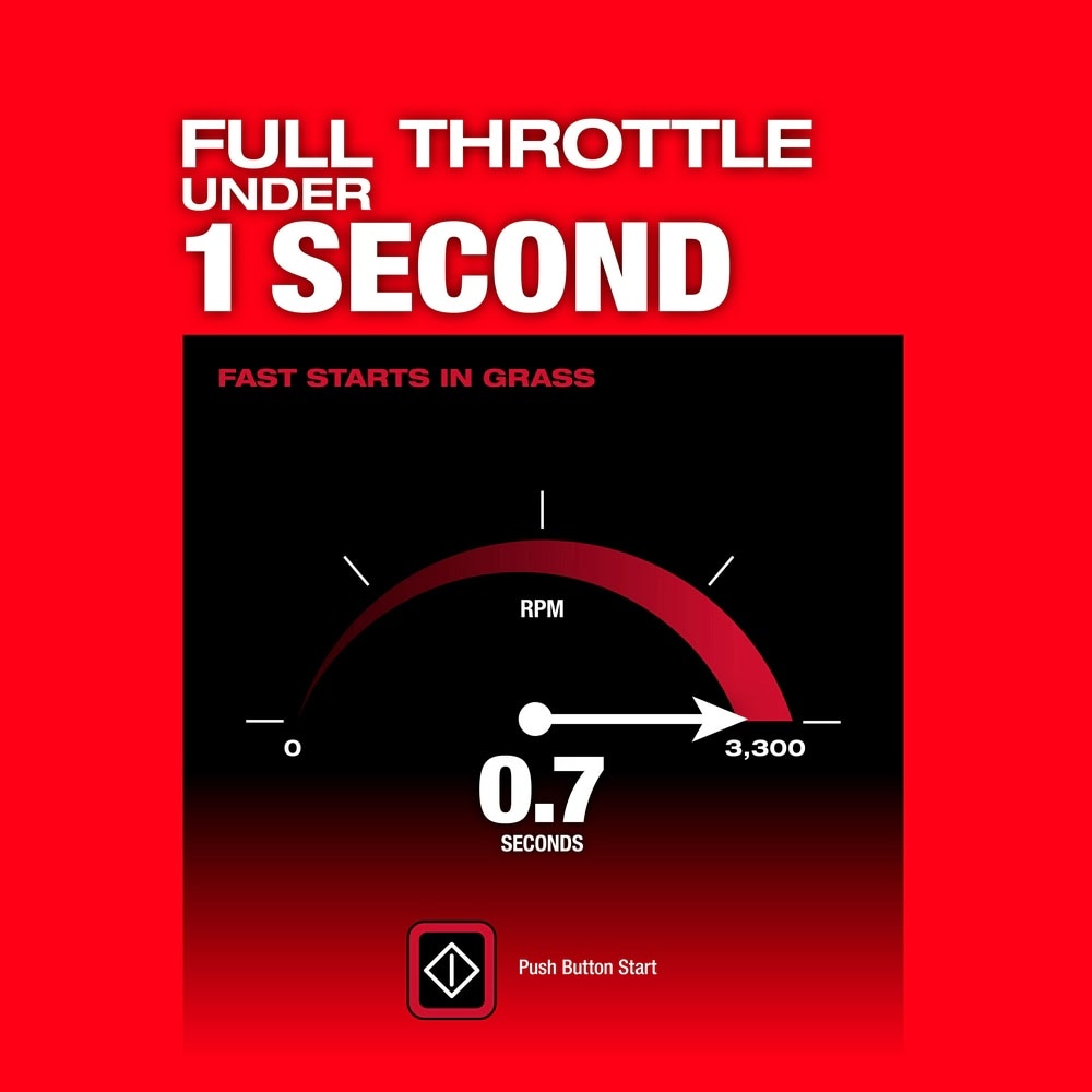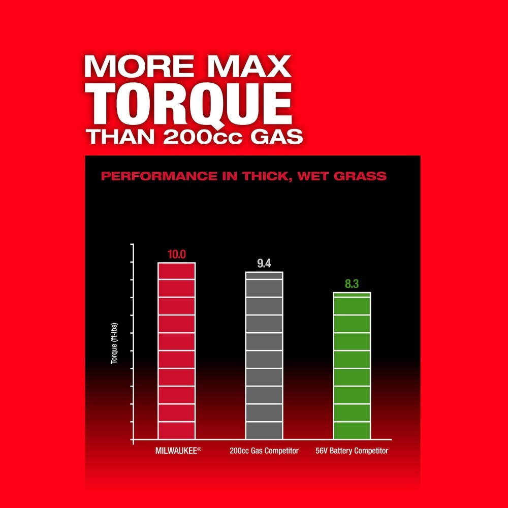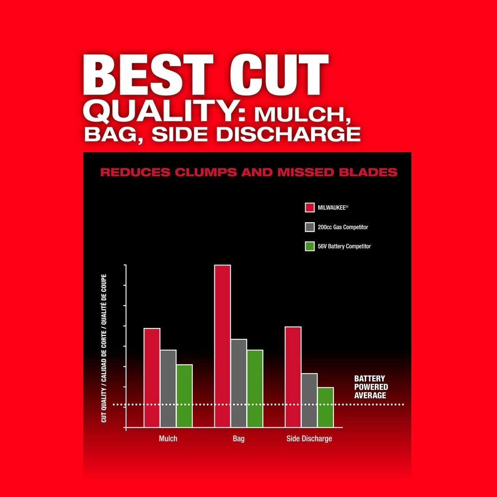 The MILWAUKEE® M18 FUEL™ 21" Self-Propelled Dual Battery Mower Kit meets the performance, durability, and ergonomic needs of landscape maintenance professionals. The optimized steel deck design paired with higher blade speed allows the battery-powered lawn mower to achieve superior airflow and increased lift to deliver the best cut quality in mulching, bagging, and side discharge applications. The POWERSTATE™ Brushless Motor delivers more max torque than 200cc gas to take on the most demanding mowing applications. Milwaukee REDLINK PLUS™ Intelligence offers total system communication between tool and battery for unmatched levels of performance, protection, and productivity. The advanced electronic package also delivers an instant throttle response on both the lawn mower blade and drive motors to reach full throttle in under 1 second, which increases control and productivity. The mower requires 2 M18™ REDLITHIUM™ Batteries for operation. When paired with the included 2 M18™ REDLITHIUM™ HIGH OUTPUT™ HD12.0 batteries, the mower delivers up to 60 minutes of runtime, allowing up to 1/2 acre of cutting when removing 1" of grass at a 3 MPH self-propelled pace. The Variable Speed Self-Propelled Mower offers speeds between 0 - 4 MPH, and the Active Speed Management Paddles allow users to easily adjust their walking pace while in operation to increase control. This battery-operated self-propelled lawn mower features a steel deck, 3-in-1 grass management, single point height adjustment, high lift mode, front & side LED lights, vertical storage, and two deck handles. The M18 FUEL™ 21" Self-Propelled Dual Battery Mower is part of the M18™ System, fully compatible with over 200 solutions.