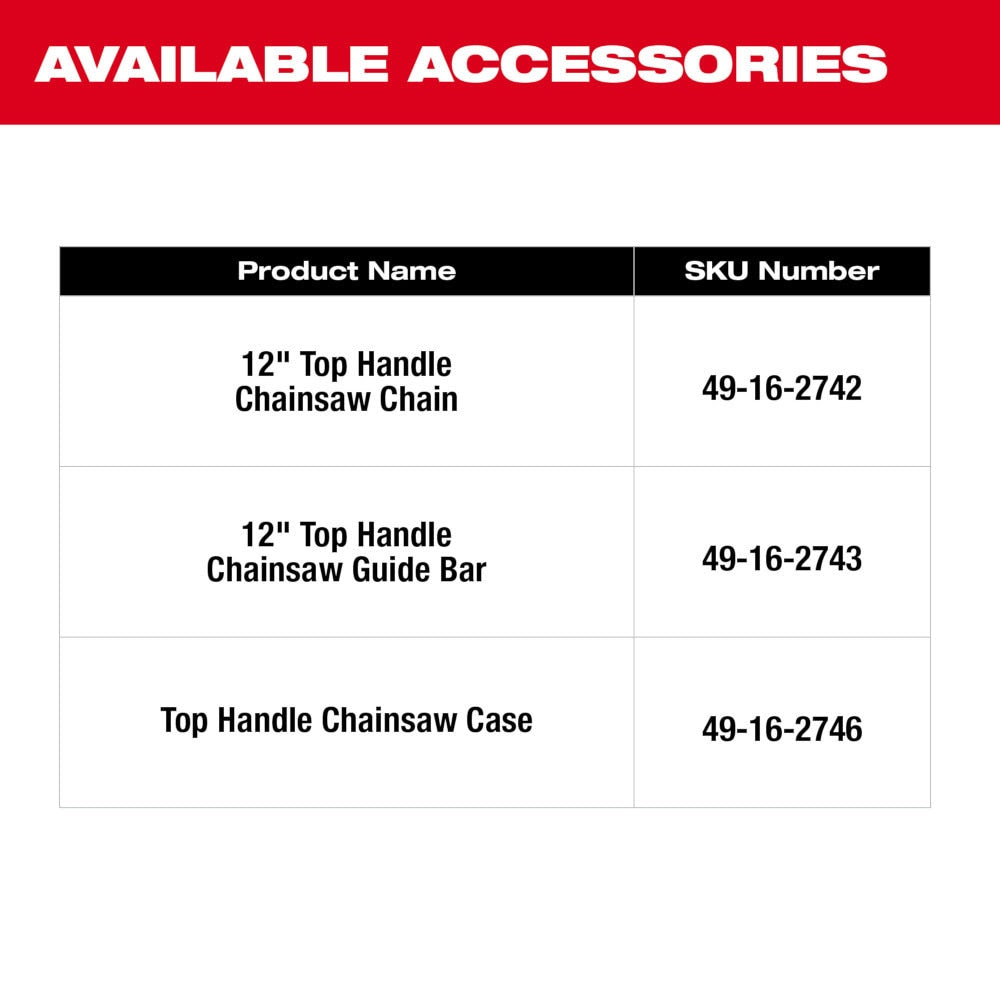 The Milwaukee M18 FUEL 12" Top Handle Chainsaw cuts faster than 35cc gas, delivers the power to cut hardwoods, and eliminates the headaches associated with gas engines. The saw is designed to meet the performance, durability, and ergonomic needs of the professional arborist, power utility linemen, and landscape maintenance professional. M18 FUEL technology allows the saw to reach full throttle in under 1 second providing ultimate control and cut faster than 35cc gas for increased application speed. The POWERSTATE Brushless Motor maintains speed under heavy loads without bogging down to outperform small gas engines and higher voltage systems. In addition to outperforming gas competitors, the saw eliminates all of the headaches associated with gas engines, such as pull starts, noise levels, emissions, and regular maintenance. The REDLINK PLUS Intelligence enables full-circle communication between the tool and battery, providing you with unmatched levels of performance, protection, and productivity. The M18 REDLITHIUM HIGH OUTPUT XC 8.0 Battery (not included) provides efficient power delivery giving you longer runtime in application with the ability to make 150 cuts per charge in 4" x4" Cedar. The saw has a professionally demanded feature set including an easy access chain tensioner, automatic oiler, metal bucking spikes, onboard scrench storage, lanyard loop, and climbing scabbard. The M18 FUEL 12" Top Handle Chainsaw is fully compatible with 250+ solutions on the M18 system.