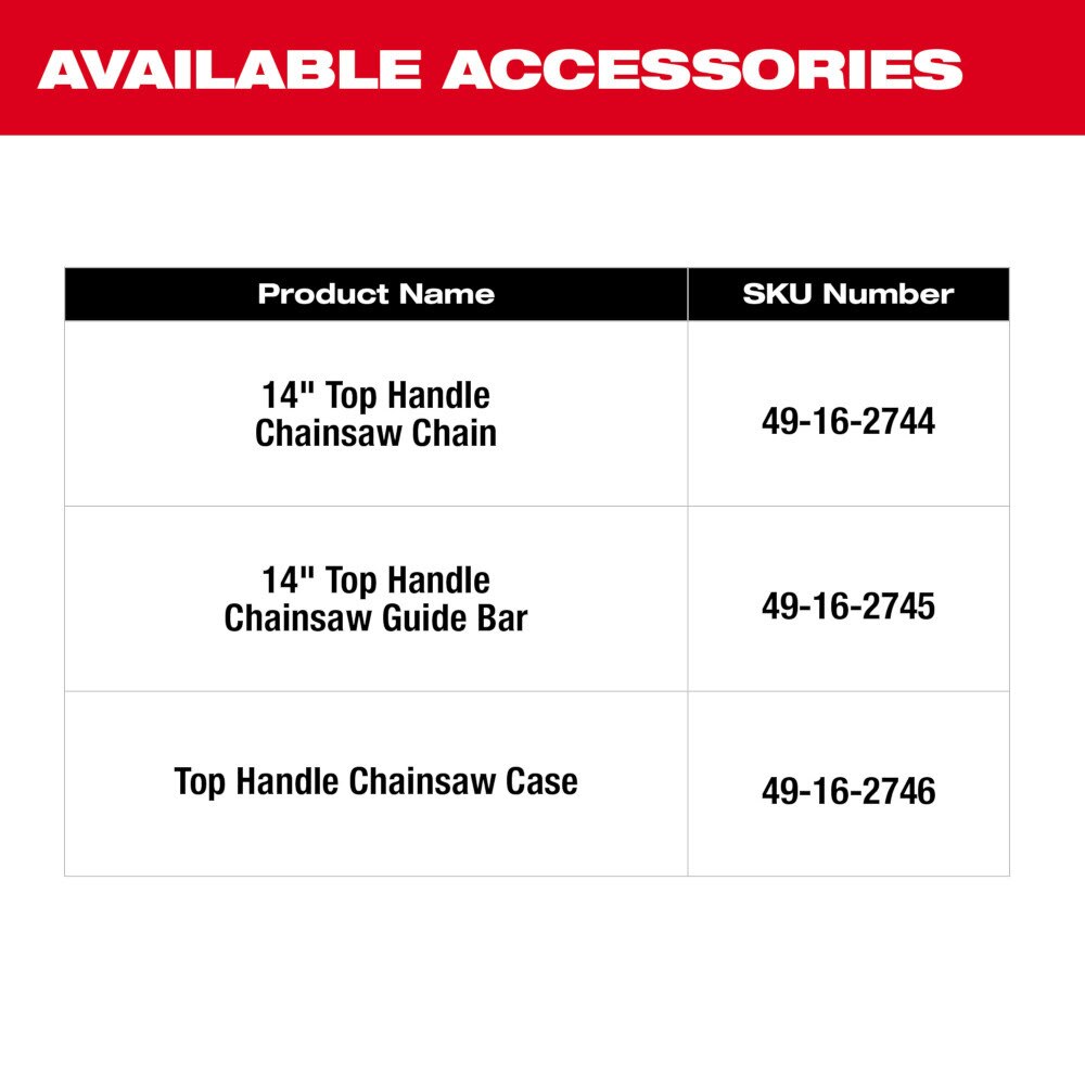 The Milwaukee M18 FUEL 14" Top Handle Chainsaw cuts faster than 35cc gas, delivers the power to cut hardwoods, and eliminates the headaches associated with gas engines. The saw is designed to meet the performance, durability, and ergonomic needs of the professional arborist, power utility linemen, and landscape maintenance professional. M18 FUEL technology allows the saw to reach full throttle in under 1 second providing ultimate control and cut faster than 35cc gas for increased application speed. The POWERSTATE Brushless Motor maintains speed under heavy loads without bogging down to outperform small gas engines and higher voltage systems. In addition to outperforming gas competitors, the saw eliminates all of the headaches associated with gas engines, such as pull starts, noise levels, emissions, and regular maintenance. The REDLINK PLUS Intelligence enables full-circle communication between the tool and battery, providing you with unmatched levels of performance, protection, and productivity. The M18 REDLITHIUM HIGH OUTPUT XC 8.0 Battery (not included) provides efficient power delivery giving you longer runtime in application with the ability to make 150 cuts per charge in 4" x4" Cedar. The saw has a professionally demanded feature set including an easy access chain tensioner, automatic oiler, metal bucking spikes, onboard scrench storage, lanyard loop, and climbing scabbard. The M18 FUEL 14" Top Handle Chainsaw is fully compatible with 250+ solutions on the M18 system.