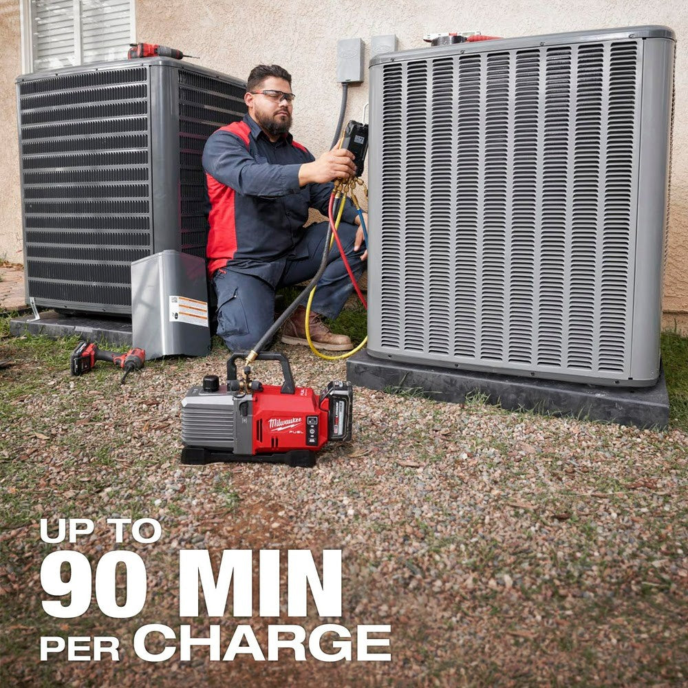 The MILWAUKEE M18 FUEL 5 CFM Vacuum Pump eliminates the hassle of cords and provides instant power for fast evacuations. Powered by M18 REDLITHIUM, this pump delivers the runtime to complete multiple jobs on one charge. With the innovation of manifold mode, the M18 FUEL 5 CFM Vacuum Pump allows you to maximize your speed and runtime in manifold setups, enabling up to 90 minutes of runtime per charge. This compact vacuum pump features a POWERSTATE Brushless Motor to enable corded speed during system pulldowns. The pump’s 1/2", 3/8", and ¼" port offerings deliver fast evacuations, especially when used with large hoses. The M18 FUEL 5 CFM Vacuum Pump is equipped with REDLINK PLUS Intelligence to ensure maximum performance and protection from overload.