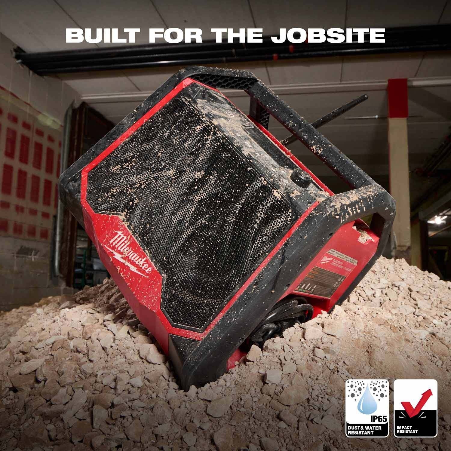 The MILWAUKEE M18 Bluetooth Jobsite Radio + Charger delivers powerful, dynamic sound for large spaces with (2) 4.48" woofers and (2) 1.21" high-frequency tweeters. Bluetooth 5.3 provides up to 200 feet of range, and AUDIO-LINK lets you connect multiple compatible Milwaukee devices for a bigger sound experience. It offers up to 8 hours of runtime on an M18 REDLITHIUM XC5.0 Battery at 100% volume, built-in equalizer settings, M18 battery charging, and USB-C personal device charging. Compatible with the PACKOUT Modular Storage System and built to withstand tough conditions with impact, dust, and water resistance.