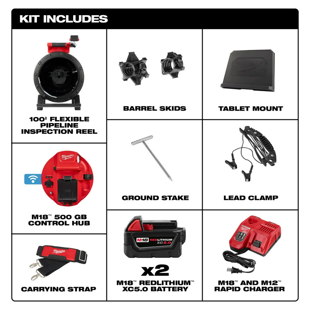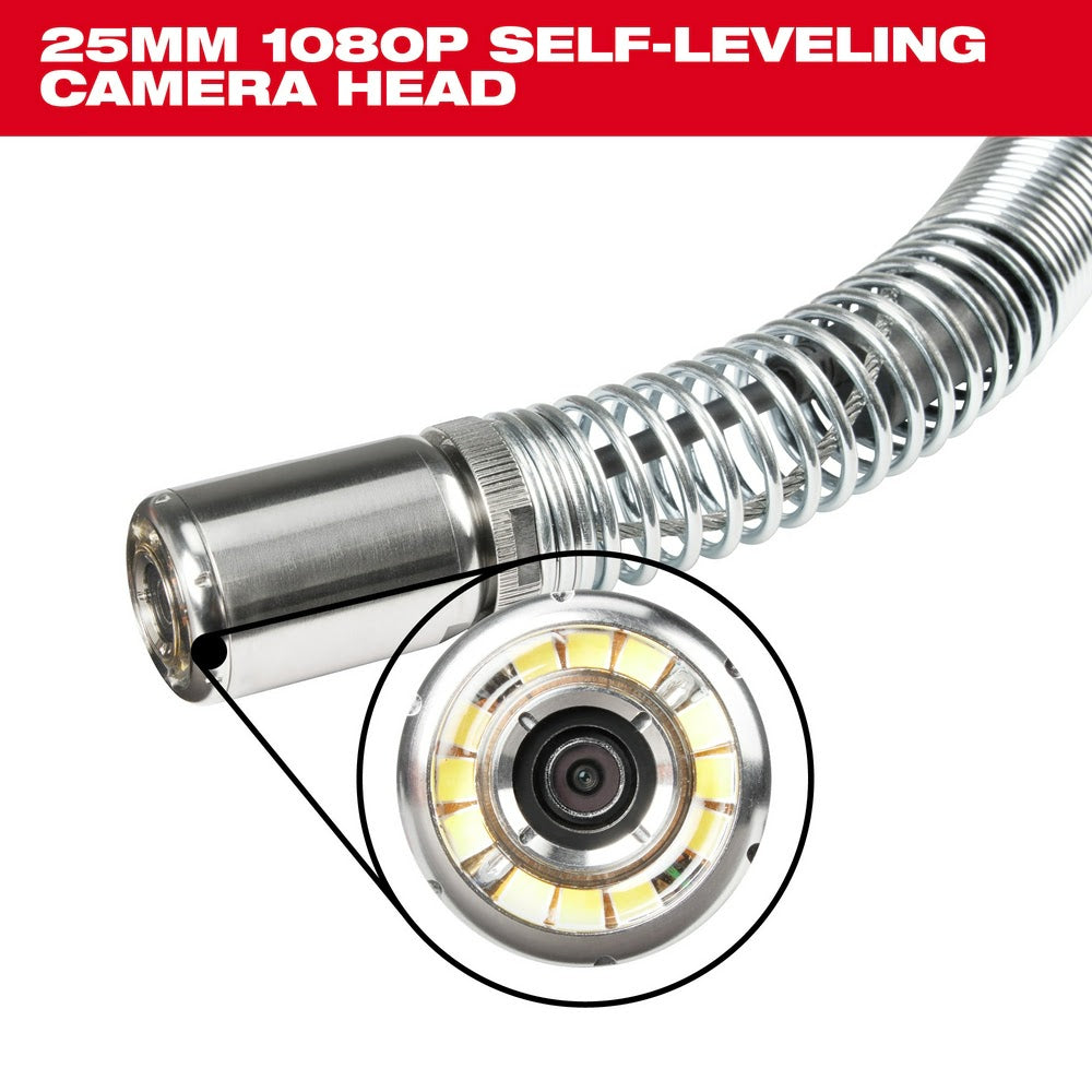 The MILWAUKEE M18 100’ Flexible Pipeline Inspection System has a flexible push cable providing the ability to navigate tight bends and traps, while delivering the clearest image and easiest inspections in 1.5"- 4” lines up to 100’. Featuring the industry’s shortest 25 mm 1080p self-leveling HD camera head, and the ability to digitally zoom up to 4X and pan, technicians can now see more in drain lines than ever before. This system features a lightweight, compact design making this Milwaukee's most portable inspection camera kit. Powered by M18 REDLITHIUM 5.0 batteries, the M18 500GB Control Hub powers the reels, stores recordings, and easily swaps between reel sizes delivering unmatched system versatility. Capture, create, and share custom photos and videos from the M18 Wireless Monitor or directly from a tablet or mobile device for faster sharing of findings. This sewer line camera is also equipped with ONE-KEY Technology, providing you with the ability to track the tool's location, manage it in inventory, and lock the tool out to help protect your investment.