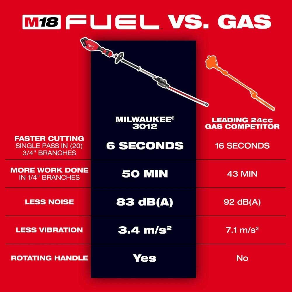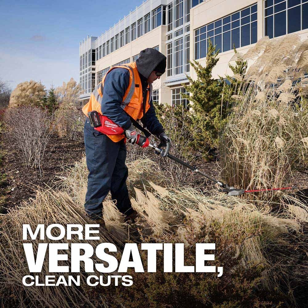 The MILWAUKEE M18 FUEL Pole Articulating Hedge Trimmer has the power to cut 1" branches, cuts faster, and provides more versatility for clean cuts. Designed to meet the needs of the landscape maintenance professional, this hedge trimmer leverages a POWERSTATE Brushless motor and 24" double-sided blades with a 1" blade gap, for faster more aggressive cutting. The cutting head allows for 270 degrees of blade articulation, giving users 12 operating positions and 1 storage position. The hedge trimmer includes a tip guard to prevent damage to the blade and surrounding work area, as well as a bail handle, padded grip, and 5-position rotating handle for optimal hand placement and increased comfort and control. This hedge trimmer's length with the REDLITHIUM FORGE XC8.0 Battery (Not Included) is 87". REDLINK PLUS Intelligence offers total system communication between tool and battery for unmatched levels of performance, protection, and productivity. The M18 FUEL Pole Articulating Hedge Trimmer is fully compatible with 275+ solutions on the M18 system.