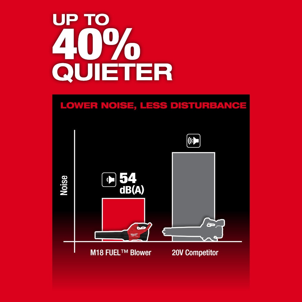 The MILWAUKEE M18 FUEL Blower is designed to meet the needs of the landscape maintenance professional in quick, routine cleanups. The POWERSTATE Brushless motor delivers 500 CFM, 120 MPH, and 12.2 N providing users with Higher Constant Power levels allowing users to clear more leaves, grass, and light debris, and reach Full Throttle in Under One Second. This cordless blower has low noise levels of 54dB(A), Up To 40% Quieter than the competition, allowing users to work comfortably and reducing disturbance to bystanders. REDLINKPLUS Intelligence offers total system communication between the blower and battery for unmatched levels of performance, protection, and productivity. The lightweight, balanced design and ambidextrous variable speed sliding lock on the lever provides users with more clearing control. This blower is optimized for use with M18 REDLITHIUM HIGH OUTPUT batteries. The M18 REDLITHIUM HIGH OUTPUT HD12.0 Battery Pack (not included) provides users with best-in-class power and run time. The M18 FUEL Blower is part of the M18 System, fully compatible with over 250+ solutions.