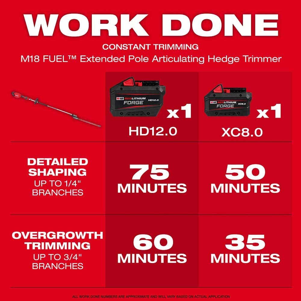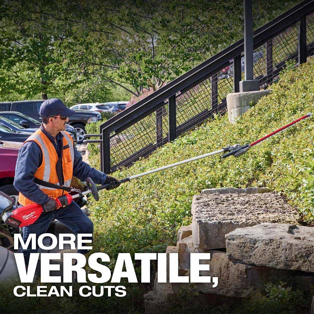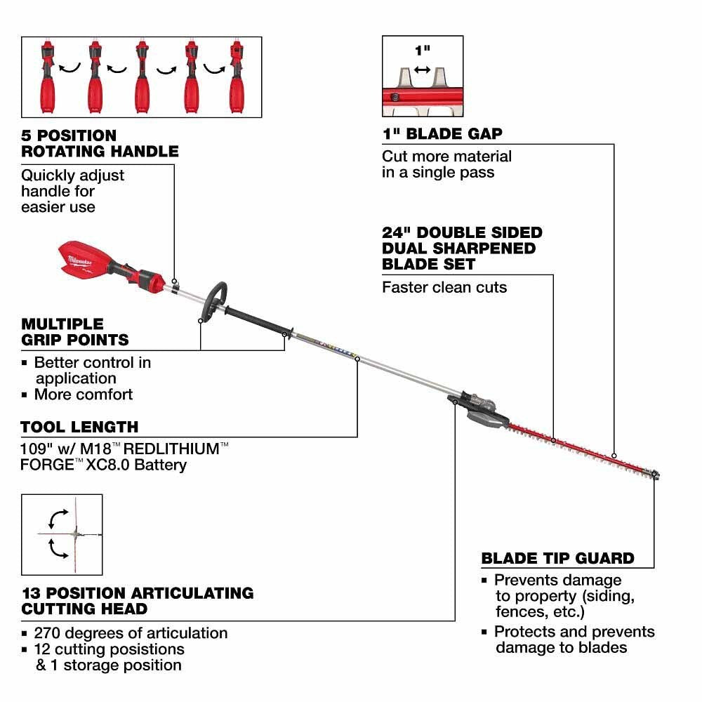 The MILWAUKEE M18 FUEL Extended Pole Articulating Hedge Trimmer has the power to cut 1" branches, cuts faster, and provides more versatility for clean cuts. Designed to meet the needs of the landscape maintenance professional, this hedge trimmer leverages a POWERSTATE Brushless motor and 24" double-sided blades with a 1" blade gap, for faster more aggressive cutting. The cutting head allows for 270 degrees of blade articulation, giving users 12 operating positions and 1 storage position. The hedge trimmer includes a tip guard to prevent damage to the blade and surrounding work area, as well as a bail handle, padded grip, and 5-position rotating handle for optimal hand placement and increased comfort and control. This hedge trimmer's length with the REDLITHIUM FORGE XC8.0 Battery (Not Included) is 108". REDLINK PLUS Intelligence offers total system communication between tool and battery for unmatched levels of performance, protection, and productivity. The M18 FUEL Pole Articulating Hedge Trimmer is fully compatible with 275+ solutions on the M18 system.