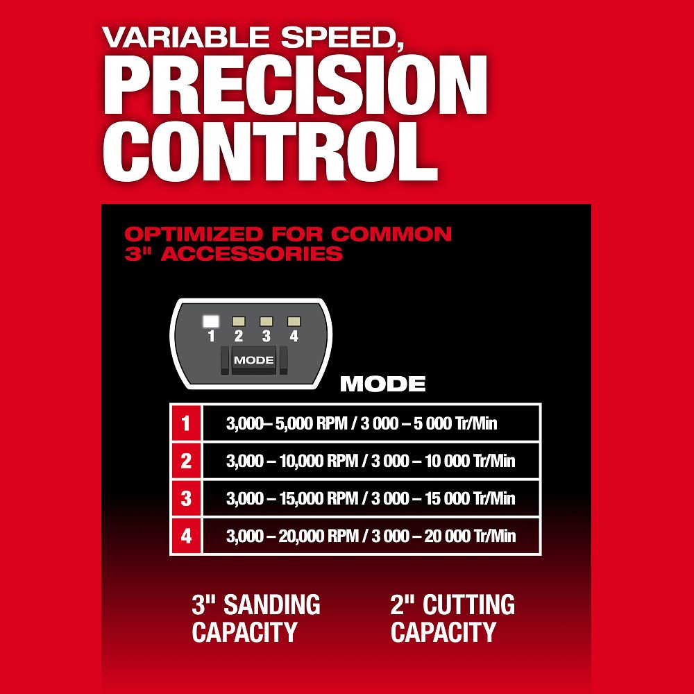 - 20,000 RPM Brushless Motor is designed to deliver greater than pneumatic performance with 2" Cutting Wheels and 3" Sanding Accessories