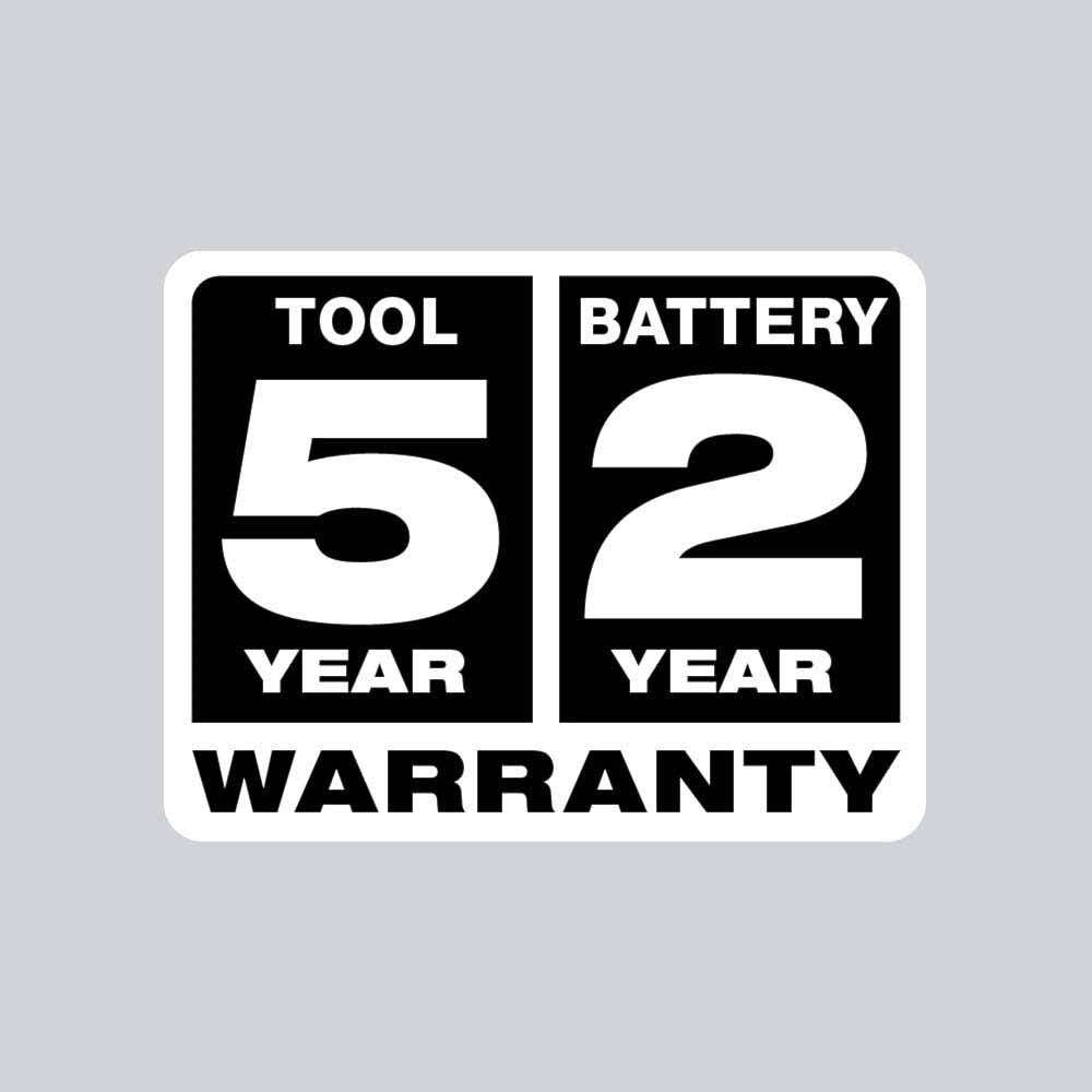 - 5 year tool warranty, 2 year battery