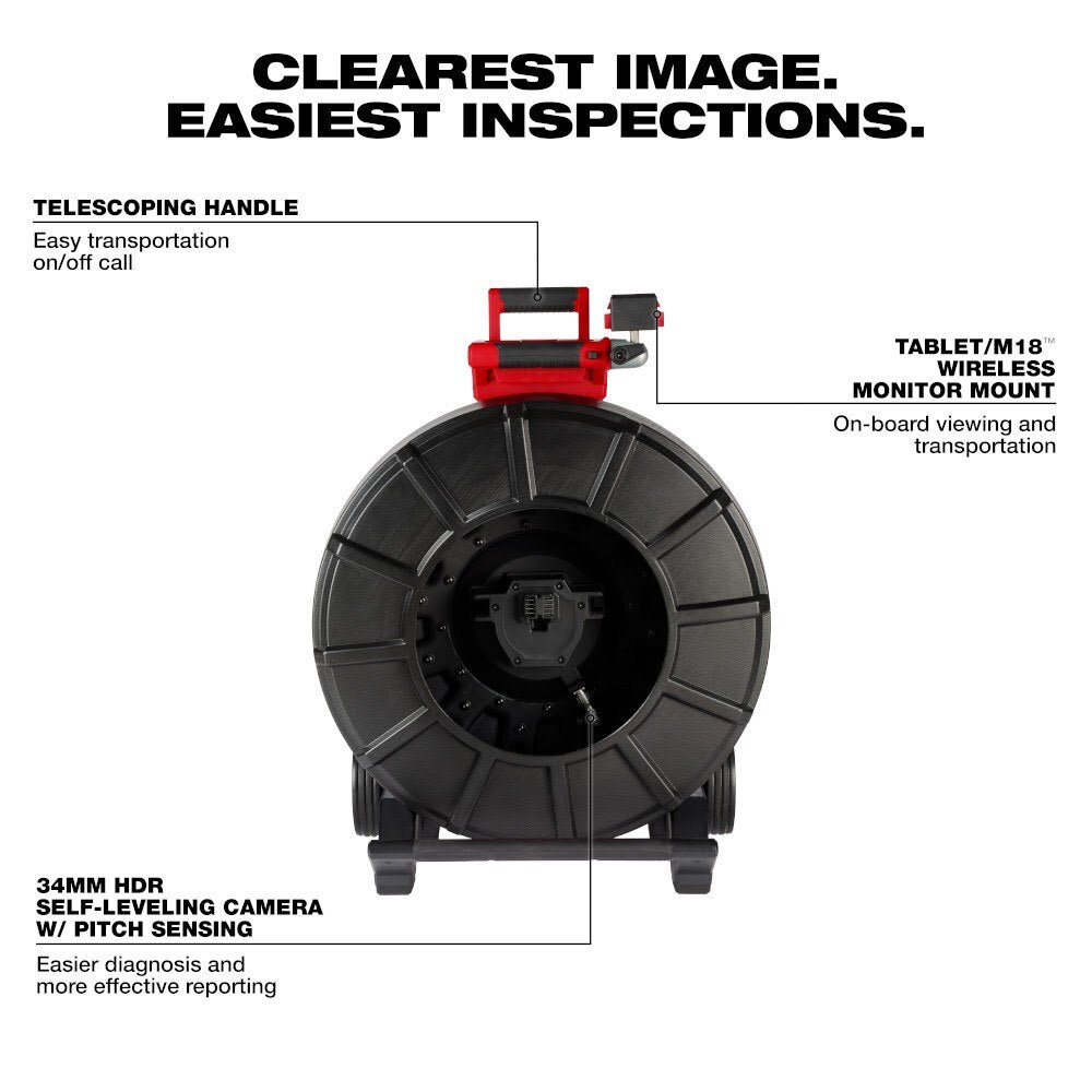 The MILWAUKEE 325’ Stiff Pipeline Inspection Reel is perfect for long runs with few turns. Designed for 3”-10” sewer lines it’s powered by the M18 500 GB Control Hub and is part of the Milwaukee M18 Modular Pipeline Inspection System. Featuring the industry’s shortest 34 mm HDR self-leveling camera head, and the ability to digitally zoom up to 4X and optimize light output inside of pipes, technicians can now see more in drain lines than ever before. The HDR self-leveling camera heads allow you to see both up close and further down the line with superior clarity, reducing washed-out areas and highlighting detail in dark conditions. The pitch sensing feature reads and displays the pitch on screen for easier diagnosis and more effective reporting. The sewer line camera has a telescoping handle and wide wheelbase making transportation on and off the job easier than ever. The 325’ Pipeline Inspection Reel includes a camera head sleeve to protect the camera from impact and skids designed to center the camera in pipes.