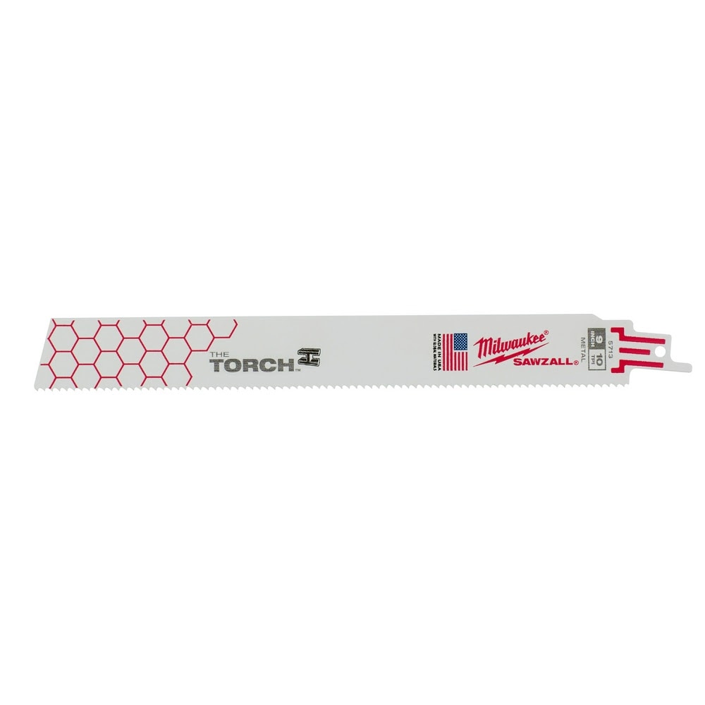 The Torch metal-cutting blades with the Double Duty Upgrade feature a tooth form optimized for the longest life and maximum durability. Tough Neck is engineered to protect against tang breakage and delivers the strongest SAWZALL blade tang on the market. Grid Iron features a stamped honeycomb pattern throughout the body of the blade that greatly increases the rigidity of the blade, making it the stiffest metal cutting SAWZALL blade on the market. These blades are ideal for making tough, straight cuts.