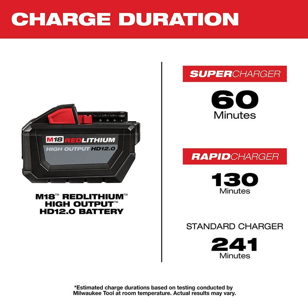 The M18™ REDLITHIUM™ HIGH OUTPUT™ HD12.0 Battery Pack provides 50% more power and runs 50% cooler vs M18™ REDLITHIUM™ HD battery packs. The massive increase in power elevates the performance of the entire M18™ system and drives the next breakthrough in M18 FUEL™, generating the power of 15A corded product. It delivers fade free power and runs substantially cooler through heavy applications, allowing tradesmen to push their cordless tools harder and longer than ever before. The M18™ REDLITHIUM™ HIGH OUTPUT™ HD12.0 is the best performing cold weather pack ever made, providing increased power in extreme cold weather conditions (below 0F / -18C). It provides the most work per charge of any professional power tool battery in the industry, driving full corded replacement on the jobsite. The REDLITHIUM™ HIGH OUTPUT™ HD12.0 battery is fully compatible with 150+ M18™ solutions.
