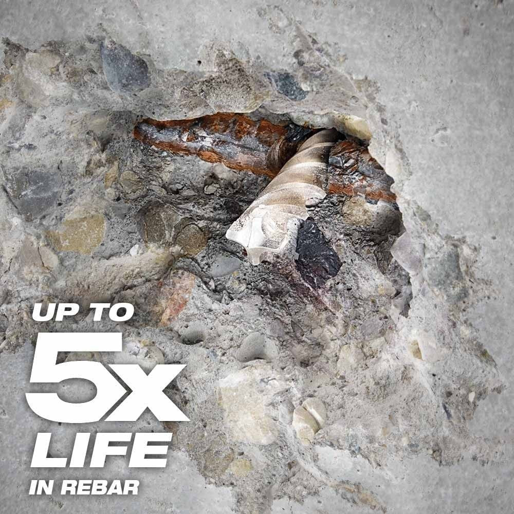 - Fits all SDS-Max rotary hammers The MILWAUKEE® MX4™ 4-Cutter SDS MAX Rotary Hammer Drill Bits with solid head carbide deliver up to 5x longer life in concrete with rebar. Engineered with rebar guards to provide maximum durability in hard aggregate and rebar. Milwaukee designed their MX4™ 4-Cutter bits with sharp centering tips for exact spot drilling in concrete. The integrated 4-cutter design prevents lock-up in rebar, reducing downtime. Optimized flutes remove dust faster, reducing heat and delivering up to 15% more holes per battery charge. The wear mark indicator on each drill bit shows you when they no longer meet the ANSI requirement. These MILWAUKEE® MX4™ 4-Cutter Drill Bits are ideal for concrete with rebar and masonry applications.