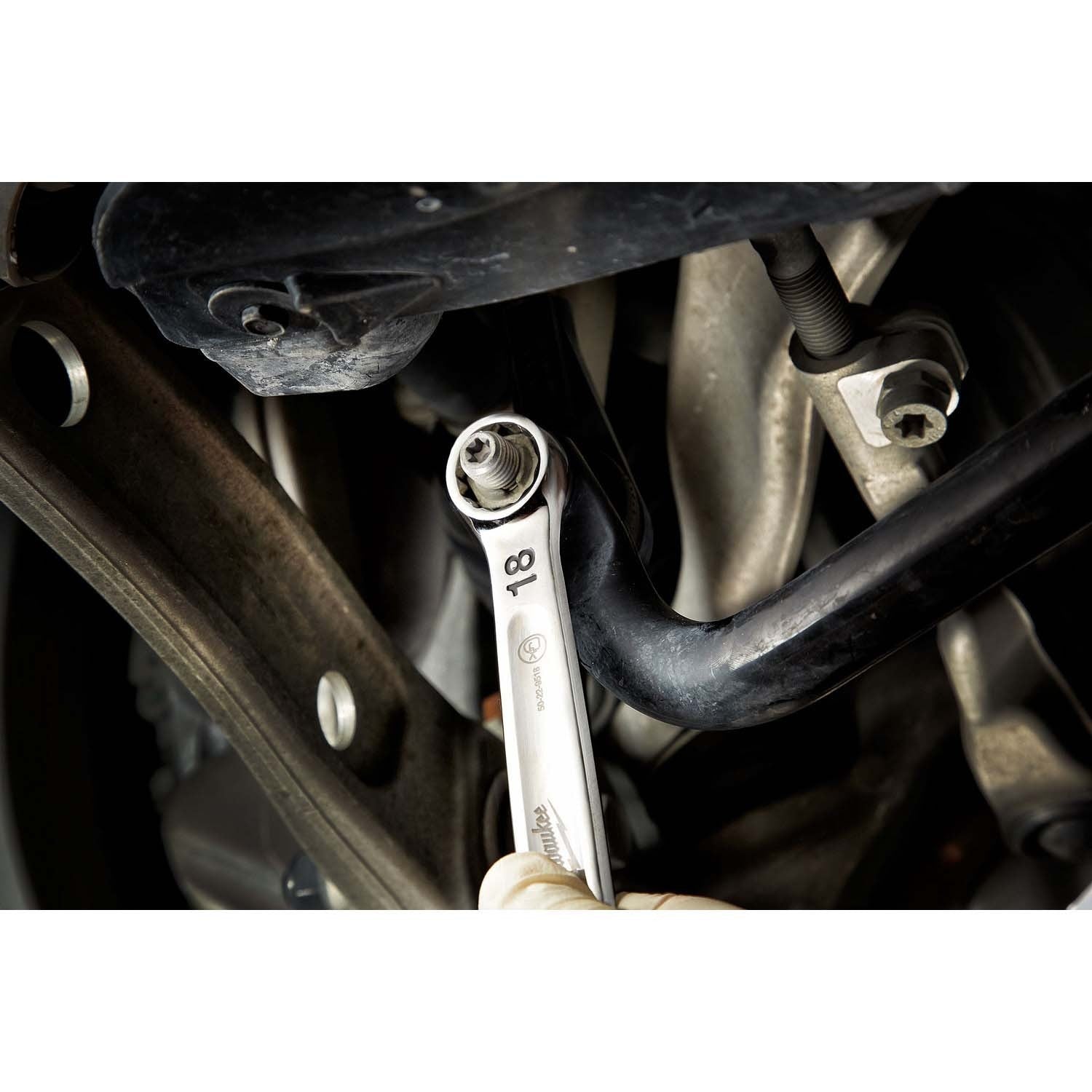 The MILWAUKEE 15pc SAE Combination Wrench Set features combo wrenches that deliver up to 25% more torque. The MAX BITE Open-End Grip improves the wrench's grip on nuts and bolts, and the geometry reduces rounding and stripping. The I-Beam handle design provides comfort in high-torque applications and features easy-to-read ink-filled size labeling. The durable reinforced tray features high-contrast EVA foam and easy-to-read size labeling for quick tool identification. The trays are designed for use in PACKOUT Drawer Tool Boxes (48-22-8444, 48-22-8443, 48-22-8442, 48-22-8447). All mechanics hand tools are backed by the Milwaukee Lifetime Guarantee.