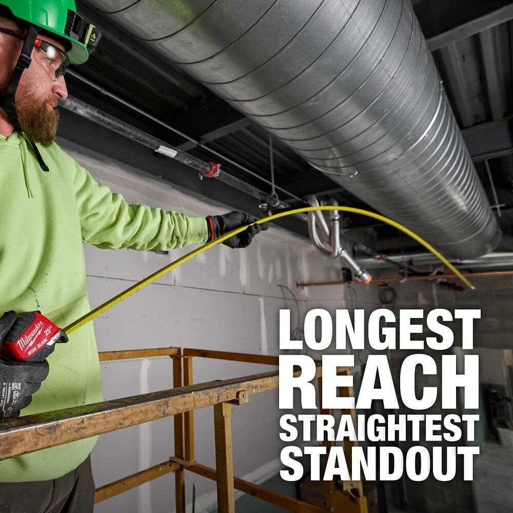 Our 16ft Wide Blade Magnetic Tape Measure delivers the longest reach and straightest standout in the industry. 16’ of Reach and 13’ of Standout allows you to take long measurements on your own and reach further on the jobsite. The Wide Blade Magnetic Tape Measure features a finger stop for quick, controlled blade retraction and double-sided anti-tear coating that reinforces the first 6” of the blade. This tape measure is equipped with a low-profile magnet and large hook for improved top and bottom hook grab onto common jobsite materials, and double-sided printing for measuring in different orientations. Built to withstand the jobsite, this tape is equipped with a fully reinforced impact resistant body and a wire form belt clip to reduce pocket tearing.
