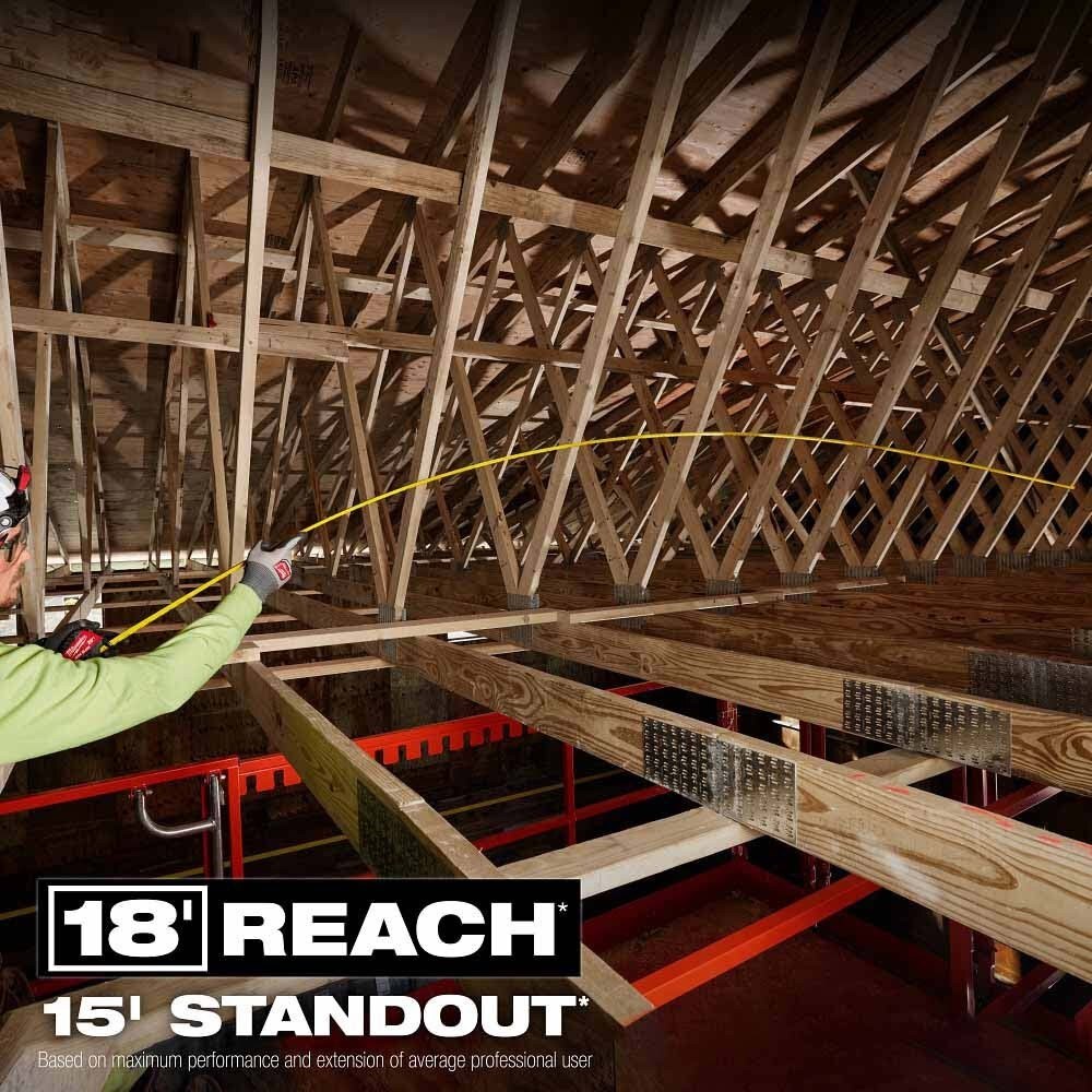 The MILWAUKEE® 30ft Wide Blade Tape Measure delivers the longest reach and straightest standout in the industry. 18’ of Reach and 15’ of Standout allow you to take long measurements on your own and reach further on the jobsite. The Wide Blade Tape Measure features a finger stop for quick, controlled blade retraction and double-sided anti-tear coating that reinforces the first 6” of the blade. This tape measure is equipped with a large hook for improved top and bottom hook grab onto common jobsite materials and double-sided printing for measuring in different orientations. Built to withstand the jobsite, this tape has a fully reinforced impact resistant body and a wire form belt clip to reduce pocket tearing.
