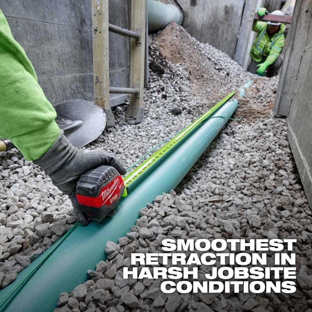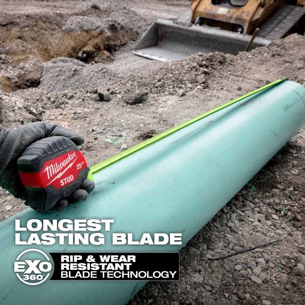 The MILWAUKEE 8m/26ft STUD Tape Measure is the Most Durable Tape in the industry. This tape measure delivers the smoothest retraction in harsh jobsite conditions and the strongest extension through debris while taking measurements on the ground. EXO360 Rip & Wear Resistant Blade Technology protects your blade on the jobsite, delivering the longest-lasting blade. The fully reinforced impact resistant body and double-sided anti-tear coating on the first 6” of the blade lead to an overall longer life in harsh groundwork conditions. The STUD Tape Measure features a hi-visibility blade for legibility in varied jobsite environments. The tape delivers 17' of Reach and 14’ of Standout, allowing you to take long measurements on your own and reach further on the jobsite.