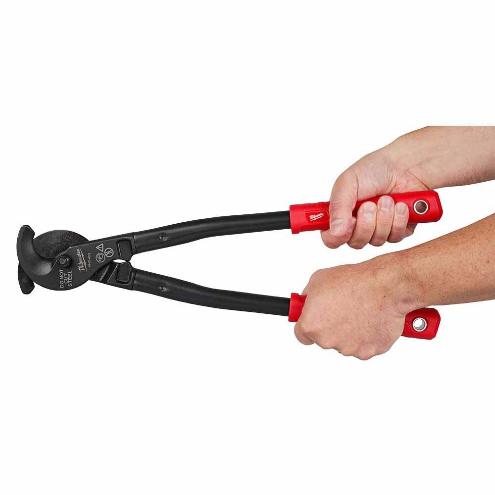 The MILWAUKEE 17” Utility Cable Cutter offers CLEAN CUTS. LONG LIFE. The shearing blades provide straight, even cuts with a max cut capacity of 350 MCM for Cu/Al cable. The forged steel blades are optimized for long life and provide maximum durability. The cable cutter handles feature a Milwaukee comfort grip that will not peel or slide off. This 17" Utility Cable Cutter is backed by a Limited Lifetime Warranty.