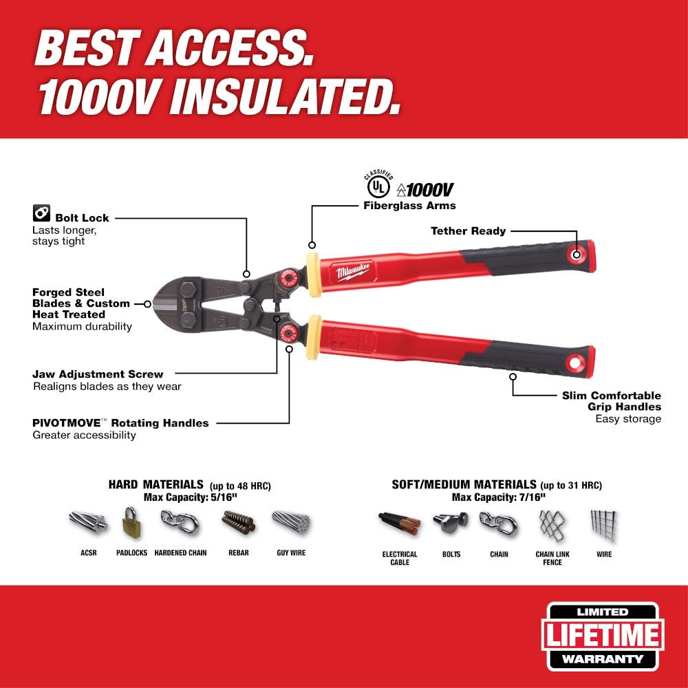 The MILWAUKEE® 24" Fiberglass Bolt Cutters with PIVOTMOVE™ Rotating Handles are engineered to give users the best access. The adaptable rotating handles allow users to make more cuts around obstacles common in utility environments. The fiberglass bolt cutters are 1000V UL classified to provide added security for users. The forged steel bolt cutter blades are custom heat treated for maximum durability. Bolt Lock secures the pivot bolts to prevent loosening. The 24" bolt cutters have slim ergonomic handles allowing for comfortable use in multiple orientations. The Fiberglass Bolt Cutters with PIVOTMOVE™ Rotating Handles have lanyard holes integrated through the handles for easy tethering.