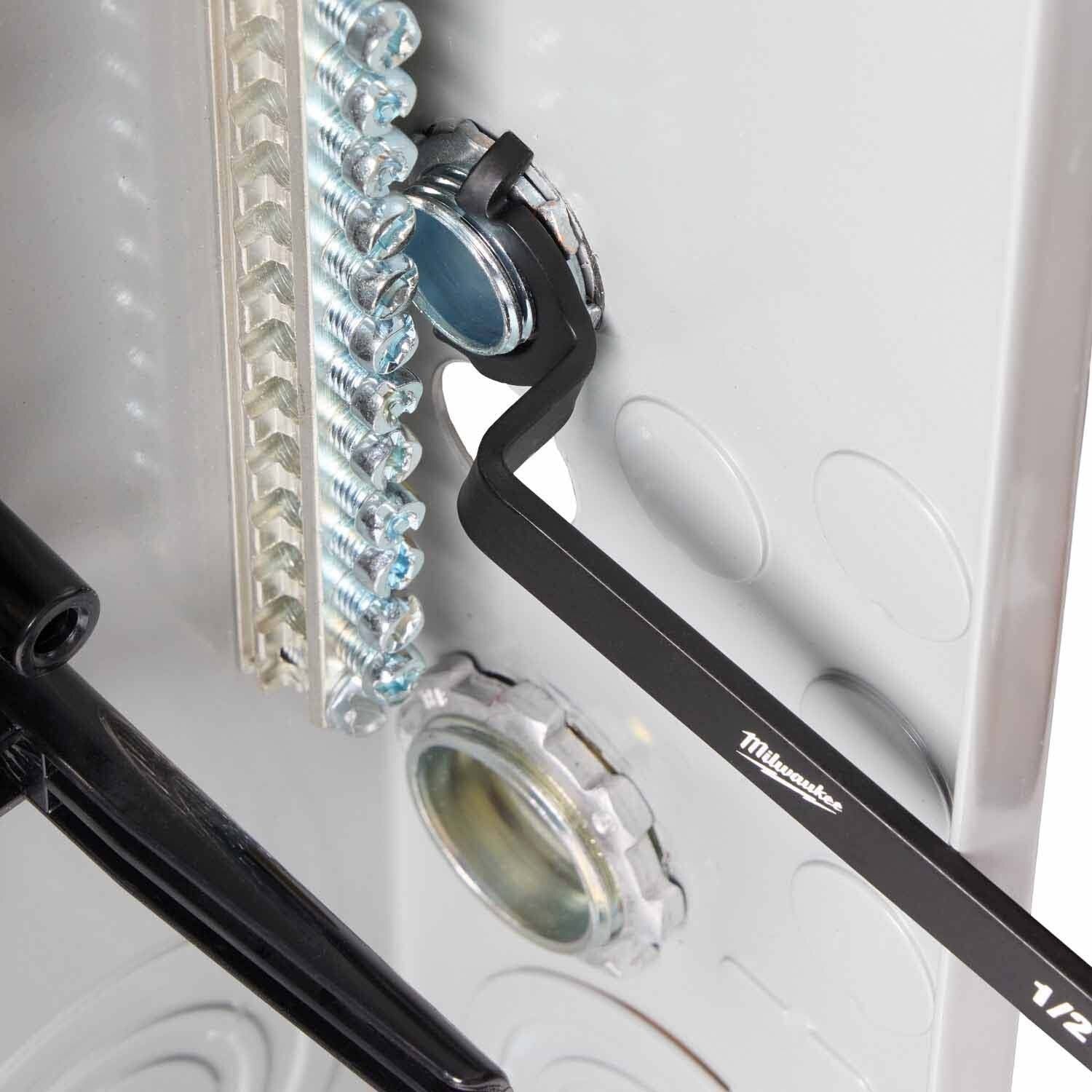 MILWAUKEE 3 Pc Locknut Wrench Set provides best access and engagement on conduit locknuts inside control panels and junction boxes. Offset head and anti-slip teeth enable tightening and loosening without repositioning, with a comfortable full-hand fit for leverage. Includes 1/2 in., 3/4 in., and 1 in. color-coded sizes; limited lifetime warranty.