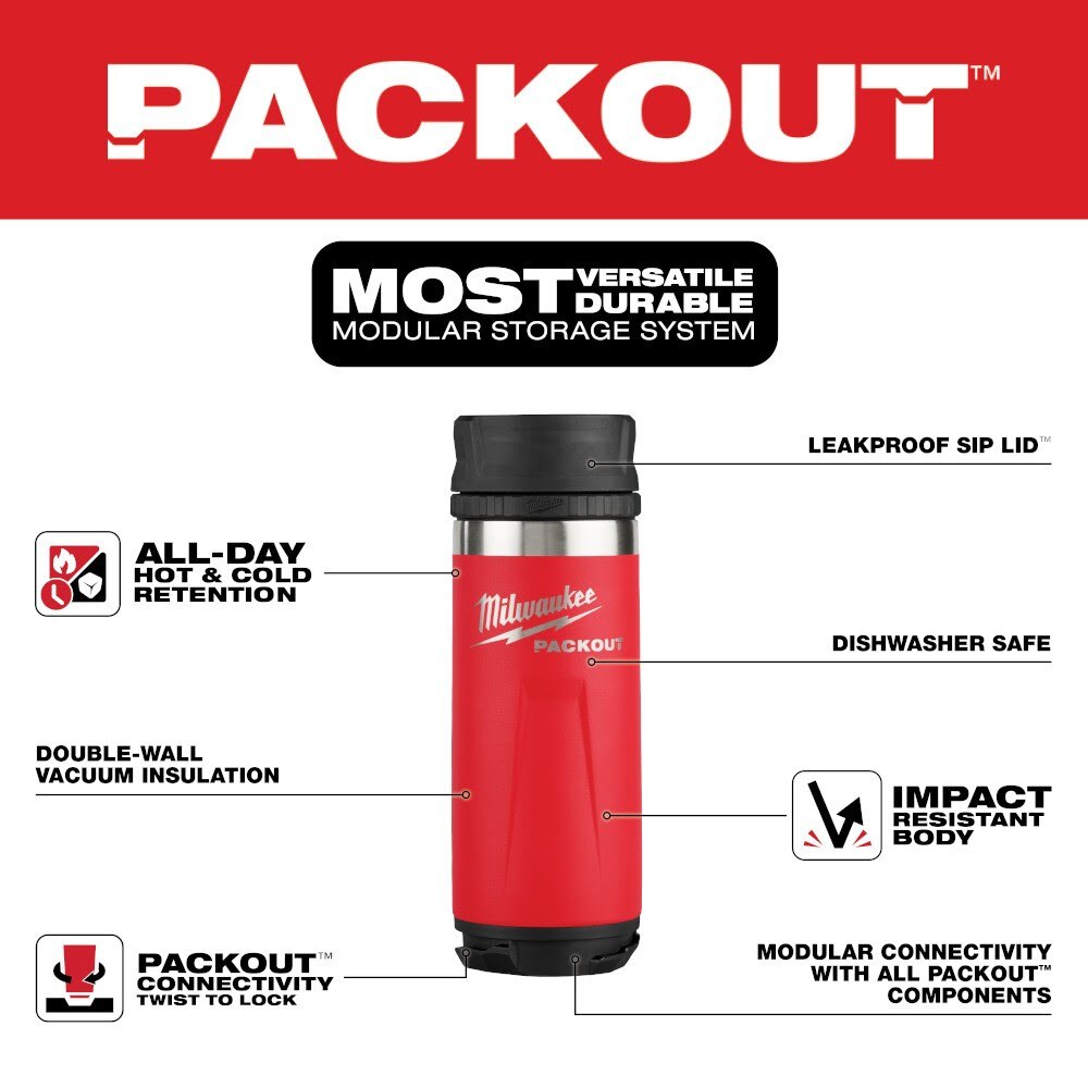 The MILWAUKEE PACKOUT 18oz Insulated Bottle with Sip Lid features twist-to-lock PACKOUT Connectivity so you can attach your bottle to the top of PACKOUT solutions, allowing for secure drink storage on the jobsite. The PACKOUT 18oz Insulated Bottle with Sip Lid has double wall vacuum insulation, keeping drinks hot or cold all day. The impact-resistant body is constructed with .8mm thick 18/8 stainless steel to withstand harsh jobsite environments. The dishwasher-safe 18oz Insulated Bottle comes with a leakproof sip lid. MILWAUKEE PACKOUT is the industry's most versatile and durable modular storage system.