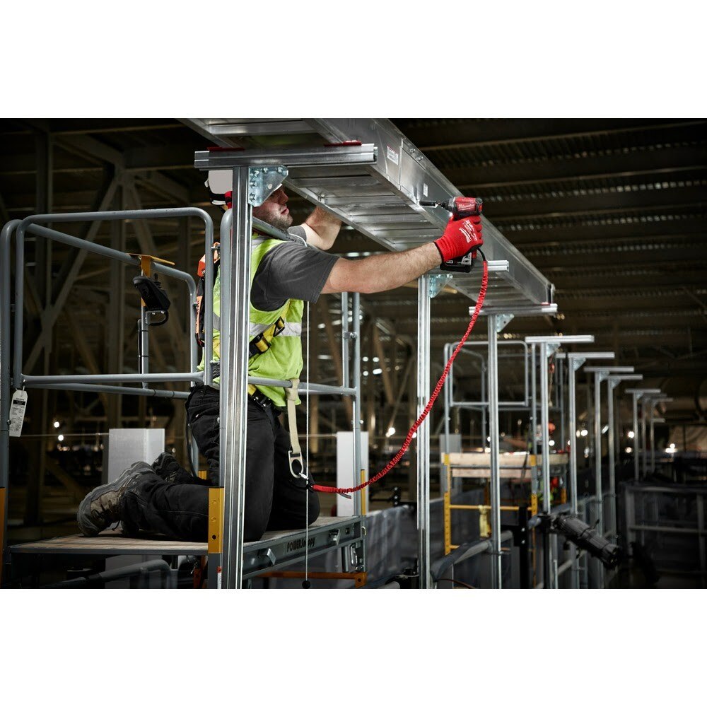 MILWAUKEE® 10lb Extended Reach Locking Tool Lanyard helps users stay safe and stay productive while working at heights by reducing the risks associated with dropped tools. The lanyard body is engineered to provide the best shock absorption, slowing the tool gradually if a drop occurs. Locking carabiners require double actions to open, ensuring a secure connection. Integrated swiveling carabiner reduces twists when using tools. The red color coded lanyard allows the user to easily identify the lanyard's weight rating. 50% longer body for extended reach. For use with tools up to ten pounds.
