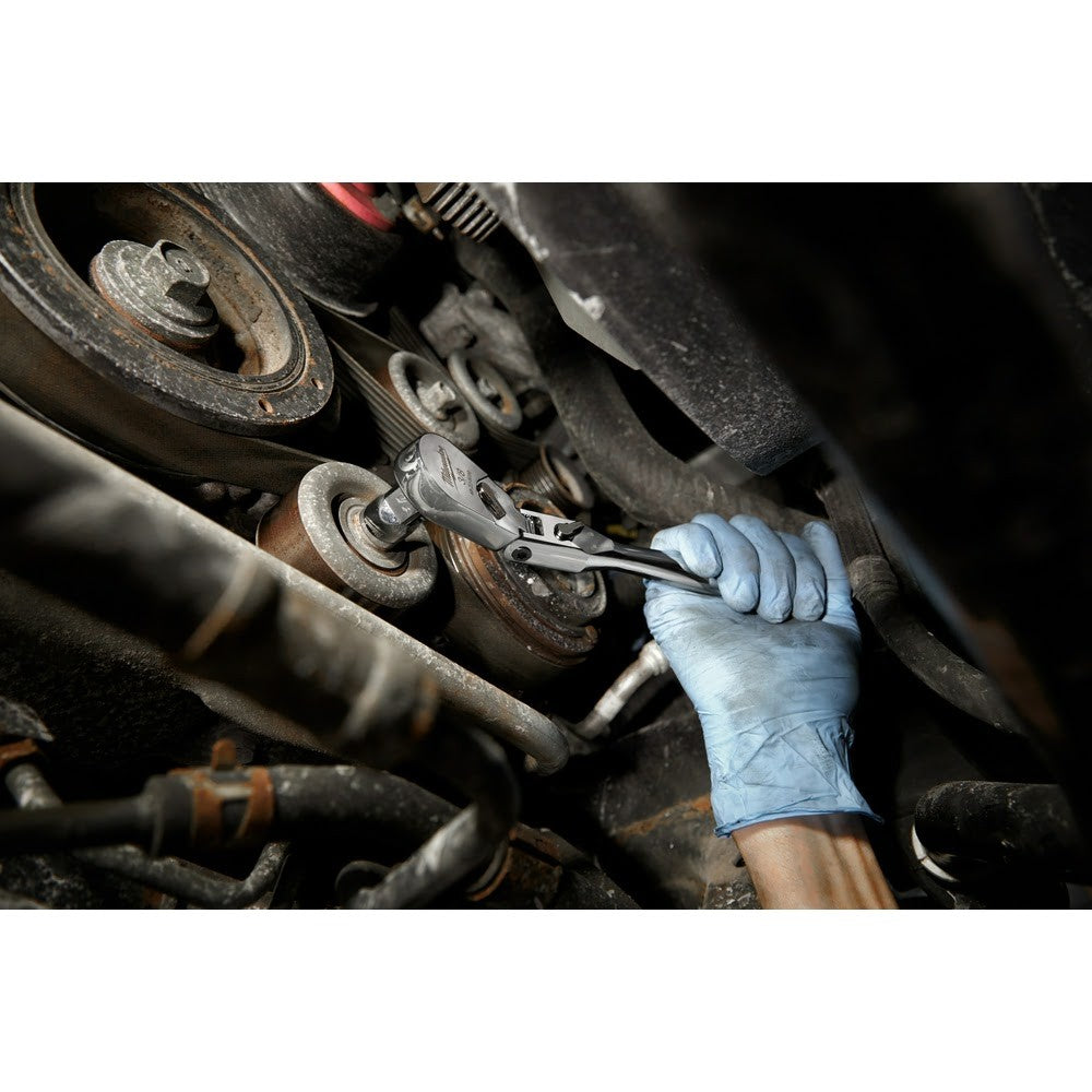 The MILWAUKEE 3/8” Drive 9” Flex Head Ratchet with a 4? arc swing provides better access and is more adaptable to working in spaces with different angles. The ratchet head can flex to 9 different positions and has a lever to lock the head in place. A slim profile head and flush directional level offer more accessibility. The all-chrome finish makes cleaning the flex head ratchet easy. This ratchet is backed by Milwaukee's Mechanics Hand Tools Lifetime Guarantee.