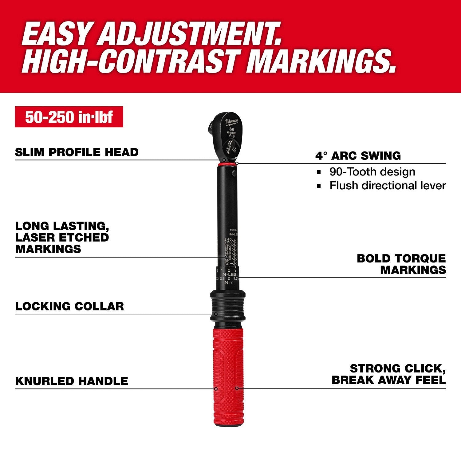 The Milwaukee 3/8 Inch Drive Click Torque Wrench with 50 to 250 in-lbf of precise torque provides easy adjustment and high-contrast markings for quick, accurate torque setting. Bold torque markings improve efficiency, while long-lasting, laser-etched markings ensure durability over time. A strong breakaway feel and audible click provide clear feedback when the target torque is reached. With a 4 Degree arc swing, this wrench allows access in tight spaces, and its 3% accuracy ensures consistent, reliable performance. The all-metal knurled handle offers a secure, comfortable grip for maximum control. Backed by a 2-year limited warranty.