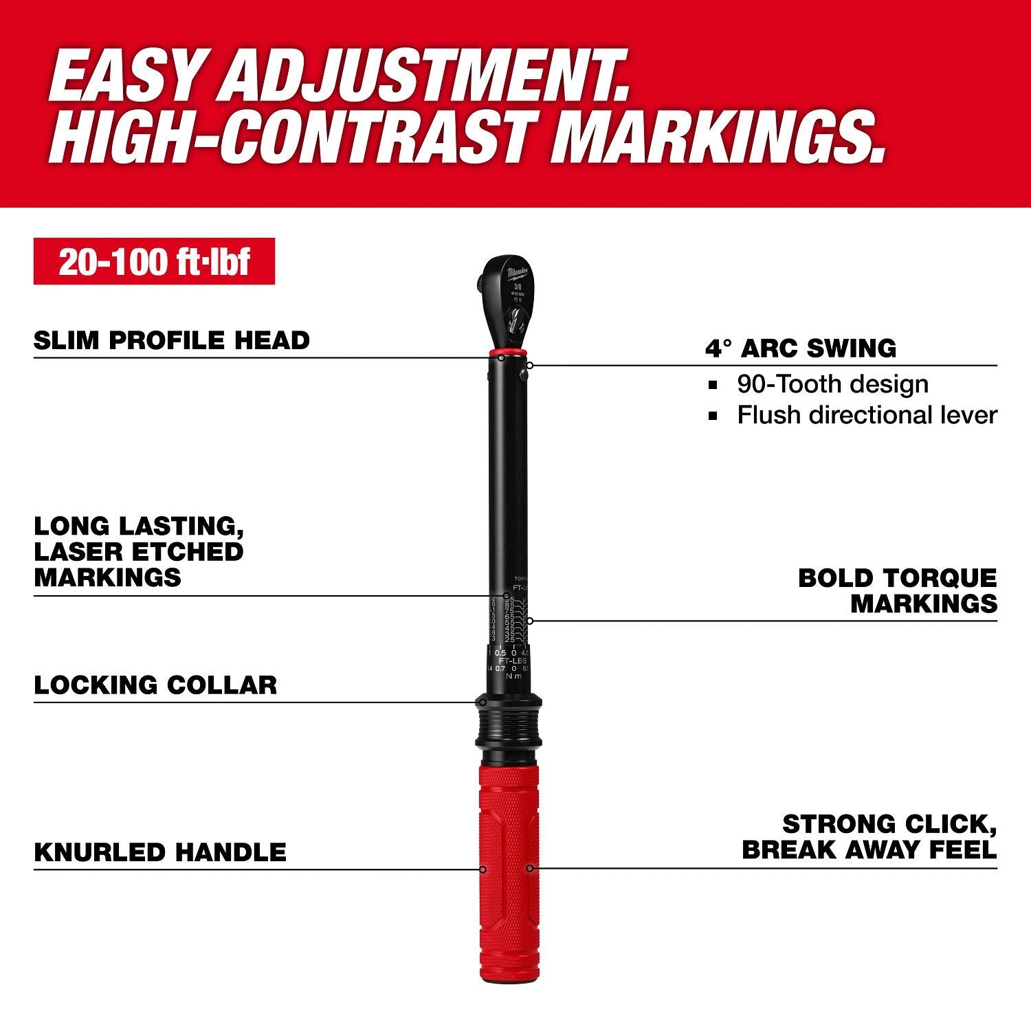The MILWAUKEE 3/8 in. Drive Click Torque Wrench delivers 20–100 ft-lbf of precise torque with easy adjustment and high-contrast, laser-etched markings for quick, accurate settings. A strong break-away feel and audible click provide clear feedback at target torque. With 4 degrees of arc swing and ±3% accuracy, it offers reliable performance in tight spaces. The all-metal knurled handle ensures a secure grip, and it’s backed by a 2-year limited warranty.