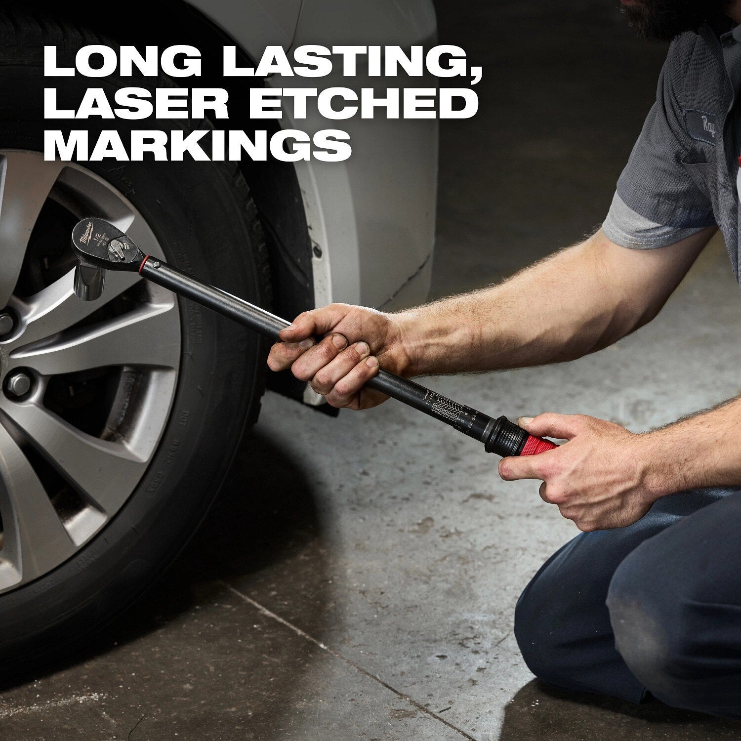 The MILWAUKEE 1/2 Inch Drive Click Torque Wrench with 50 - 250 ft-lbf of precise torque provides easy adjustment and high-contrast markings for quick, accurate torque settings. Bold torque markings improve efficiency when adjusting values, while long-lasting, laser-etched markings ensure durability over time. A strong breakaway feel and audible click give clear feedback when the target torque is reached. With a 4-degree arc swing, this wrench allows access in tight spaces, and its +/- 3% accuracy ensures consistent, reliable performance. The all-metal knurled handle provides a secure, comfortable grip for maximum control. Backed by a 2-year limited warranty.