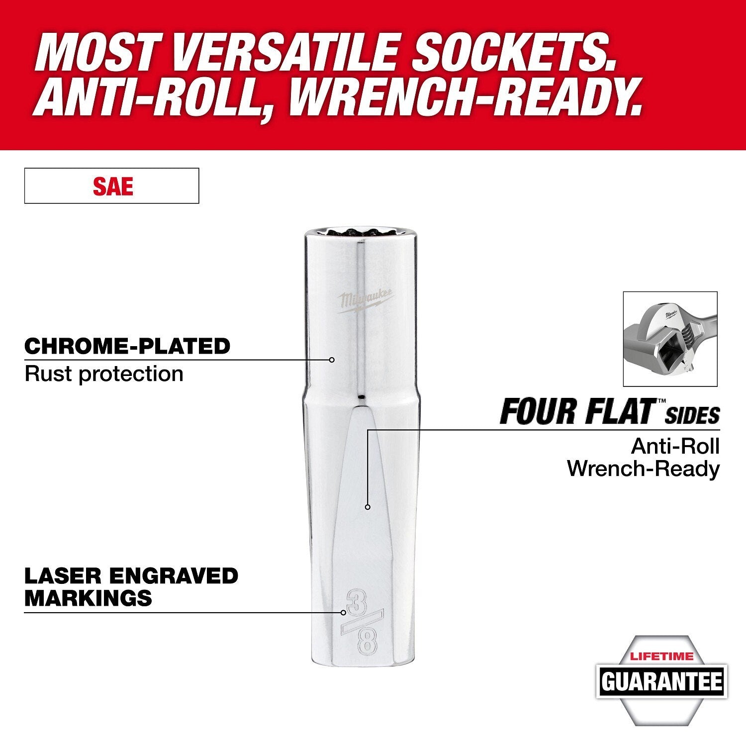 The MILWAUKEE 13pc 1/2" Drive 12-Point SAE Deep Well Socket Set with FOUR FLAT sides is designed from the ground up to be part of the most versatile socket family. Milwaukee sockets feature an innovative design with four parallel flat sides, which deter rolling and are wrench compatible. The laser-engraved size markings provide easy identification, and chrome plating offers rust and corrosion protection. This set includes a storage rail for better organization. All Milwaukee sockets are backed by a Lifetime Guarantee.