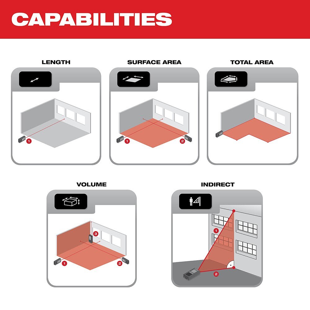 Milwaukee Tool 150’ Laser Distance Meters are designed to provide the easiest measurements from all orientations, and feature an array of new functionality. 2” color screens offer maximum visibility in low light conditions. Each features a simplified user interface that has been designed from the ground up for fast navigation so users can quickly choose their function and take a measurement with minimal downtime. For additional ease of use, the 150’ Laser Distance Meter includes a built-in 2-position auto-detecting lever so users can easily measure in corners. Each 150’ Laser Distance Meters offer several different measurement functions that allow users to add and subtract values and calculate linear distance, surface area, total area, and volume. In addition, each tool includes memory storage for 30 readings and impact-resistant overmold for protection from tough jobsite conditions. Milwaukee Laser Distance Meters also feature a side shot button for an easier, more ergonomic experience when measuring in all directions.