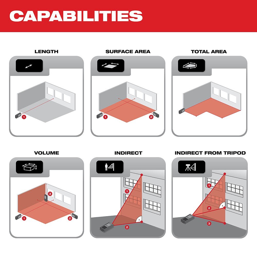 Milwaukee Tool 330’ Laser Distance Meters are designed to provide the easiest measurements from all orientations, and feature an array of new functionality such as intuitive user interfaces, 3-position auto-detecting levers, and an industry-first digital auto-level. 2” color screens offer maximum visibility in low light conditions. Each features a simplified user interface that has been designed from the ground up for fast navigation so users can quickly choose their function and take a measurement with minimal downtime. Exclusive to the Milwaukee 330’ Laser Distance Meter is the digital auto-level feature. This new functionality allows for a measurement to be automatically taken when the meter reaches a level position, increasing accuracy when measuring long distances. For additional ease of use, the 330’ solution provides a 3-position auto-detecting lever that allows for measurements from corners and edges. Each 330’ Laser Distance Meters offer several different measurement functions that allow users to add and subtract values and calculate linear distance, indirect height and length, surface area, total area, and volume. In addition, each tool includes memory storage for 30 readings and impact-resistant overmold for protection from tough jobsite conditions. Milwaukee Laser Distance Meters also feature a side shot button for an easier, more ergonomic experience when measuring in all directions.