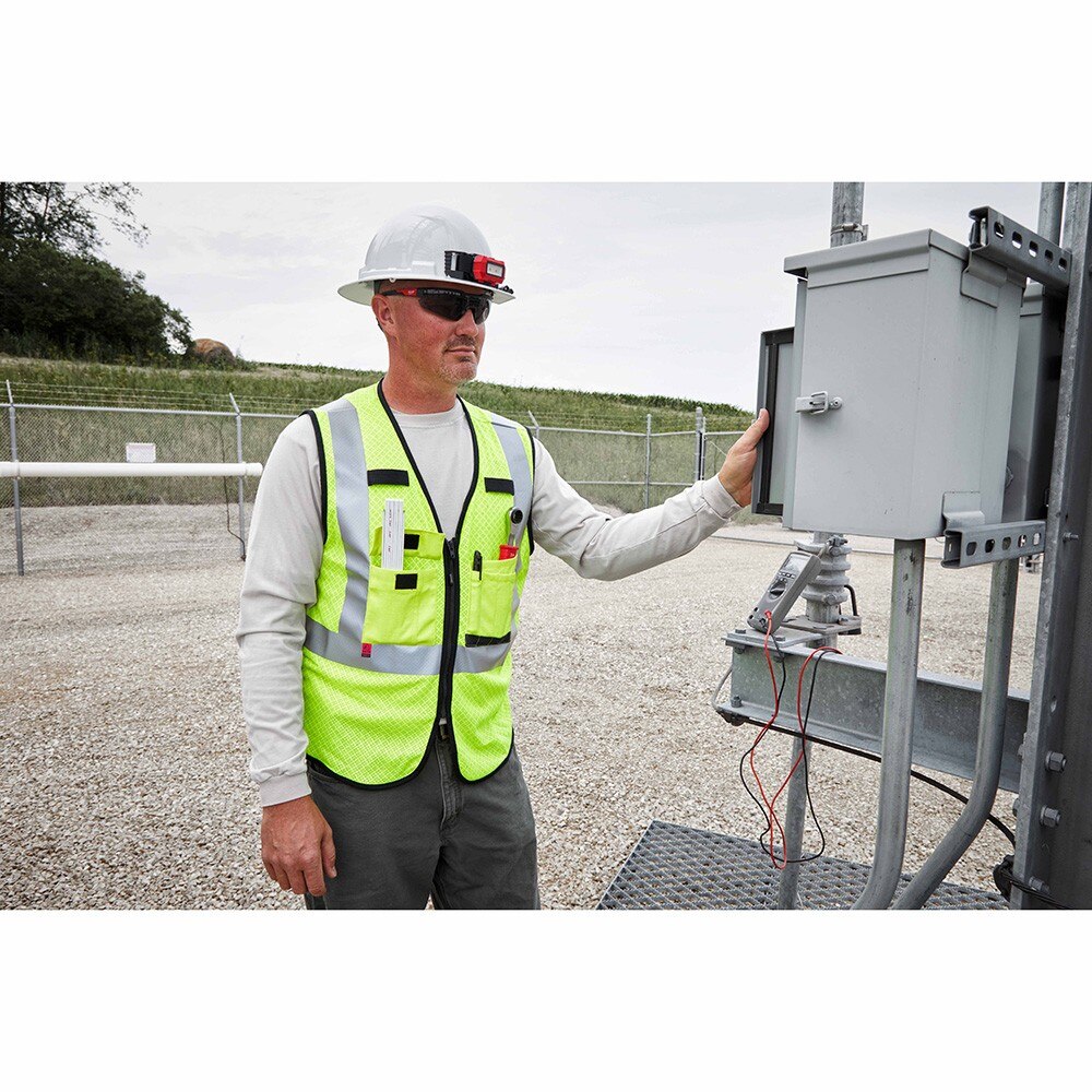 The MILWAUKEE® 4XL/5XL AR/FR CAT. 1 Class 2 Mesh High Visibility Safety Vest is engineered to carry more with breathable protection. This Arc-Rated and Flame-Resistant Vest has ten pockets, including pen pockets, a chest pocket with closure, and an internal pocket for easy access to essential items while on the job. The yellow safety vest features a quick internal size adjustment for better fit and a durable pass-through slit for fall protection gear. AR/FR breathable, anti-static GLENGUARD® Mesh provides added comfort when wearing the vest as part of a complete AR/FR garment system and rated to an ATPV of 4.0 cal./cm². The high visibility reflective safety vests are required when working around traffic going 25 MPH or working around heavy machinery. This includes construction, road construction, traffic direction, utility crews, and survey crews. AR/FR CAT. 1 Class 2 Safety Vests are ANSI compliant and can be customized by adding a logo.