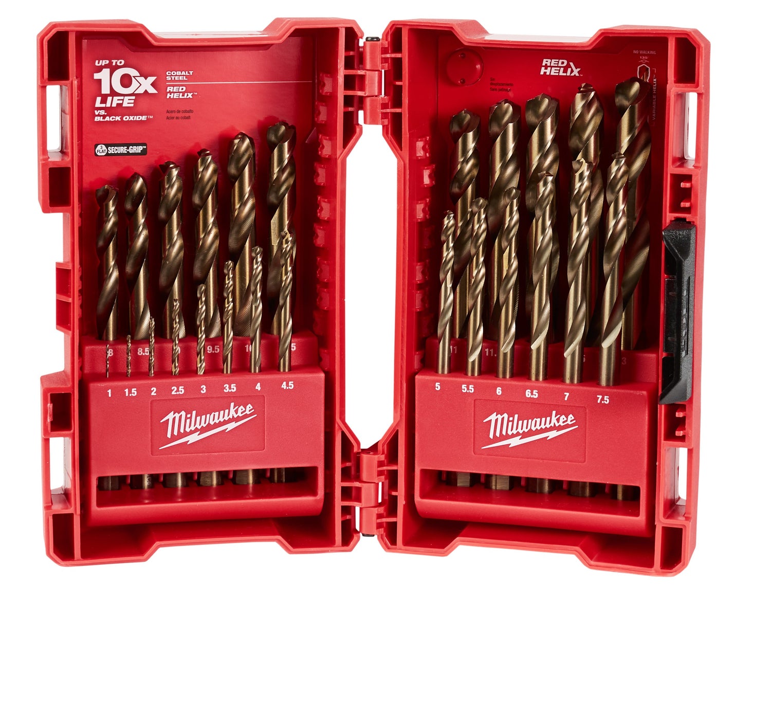 Milwaukee® COBALT RED HELIX™ drill bits are engineered for extreme durability and long life in hard metal applications. Designed with a variable helix ™ that includes an aggressive 35° helix angle which ends at 15°, the cobalt bits with RED HELIX™ provide Rapid Chip Removal™ limiting heat buildup to Stay Sharper Longer™. The 135° split point tip delivers a precision start and prevents walking for fast, accurate holes. Ideal for tough applications and provide up to 10X life vs. Black Oxide Drill Bits™ but can be used in all twist drilling applications.
