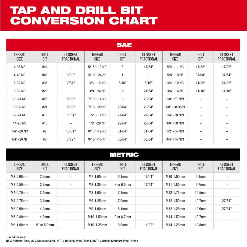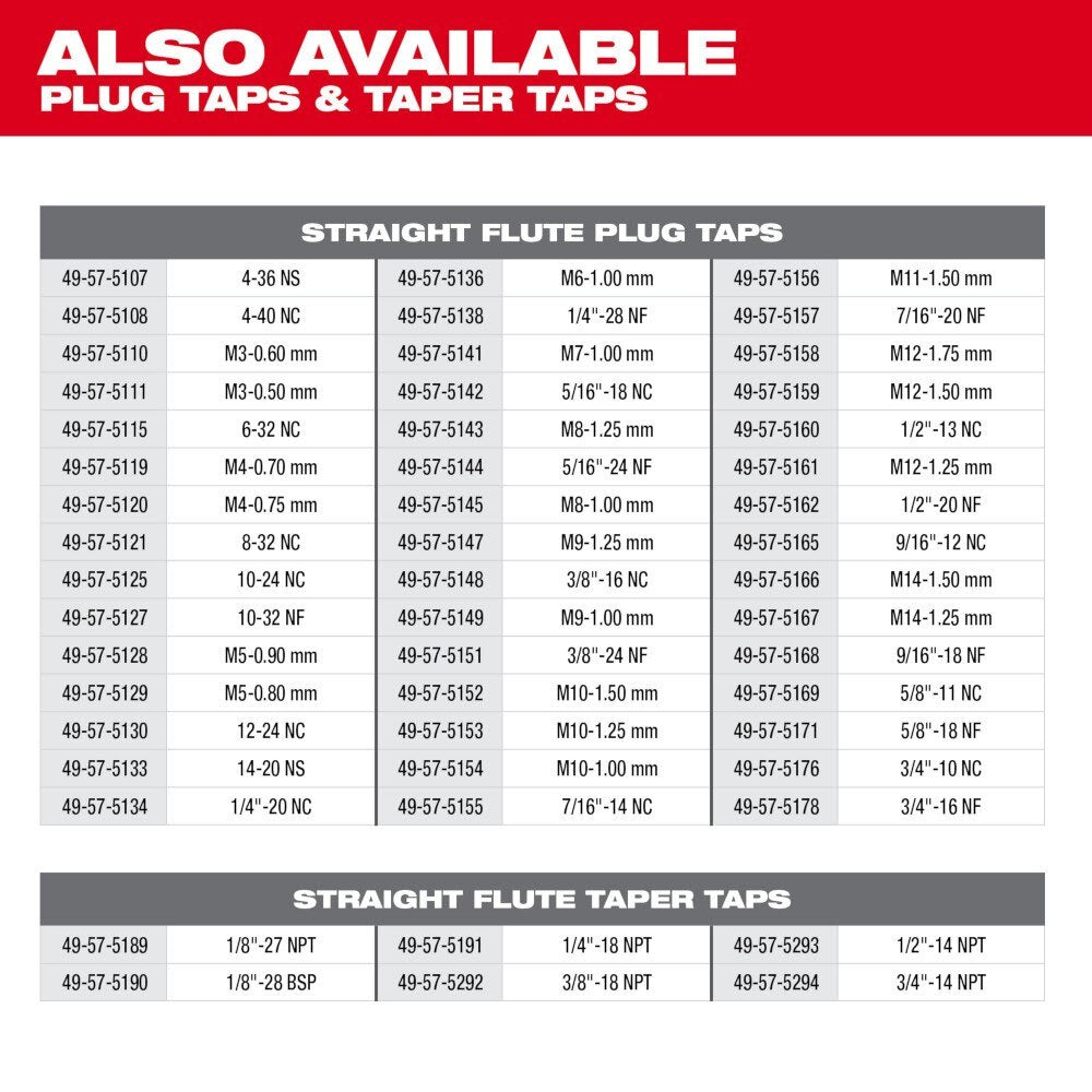 The MILWAUKEE Straight Flute Taper Taps are precision machined for creating or repairing clean, accurate (internal) threads. The Taper Taps feature long-lasting laser-etched sizing for the clearest markings and include a protective Black Oxide coating for corrosion resistance. The square shank is compatible with all standard tap handles or tap wrenches and the taper style is designed for gradual starts while cutting threads. Engineered for durability, MILWAUKEE Straight Flute Plug Taps are designed for cutting threads in the most common metal applications including brass, aluminum, mild steel, and more. For best results, use Taper Taps with cutting fluid.
