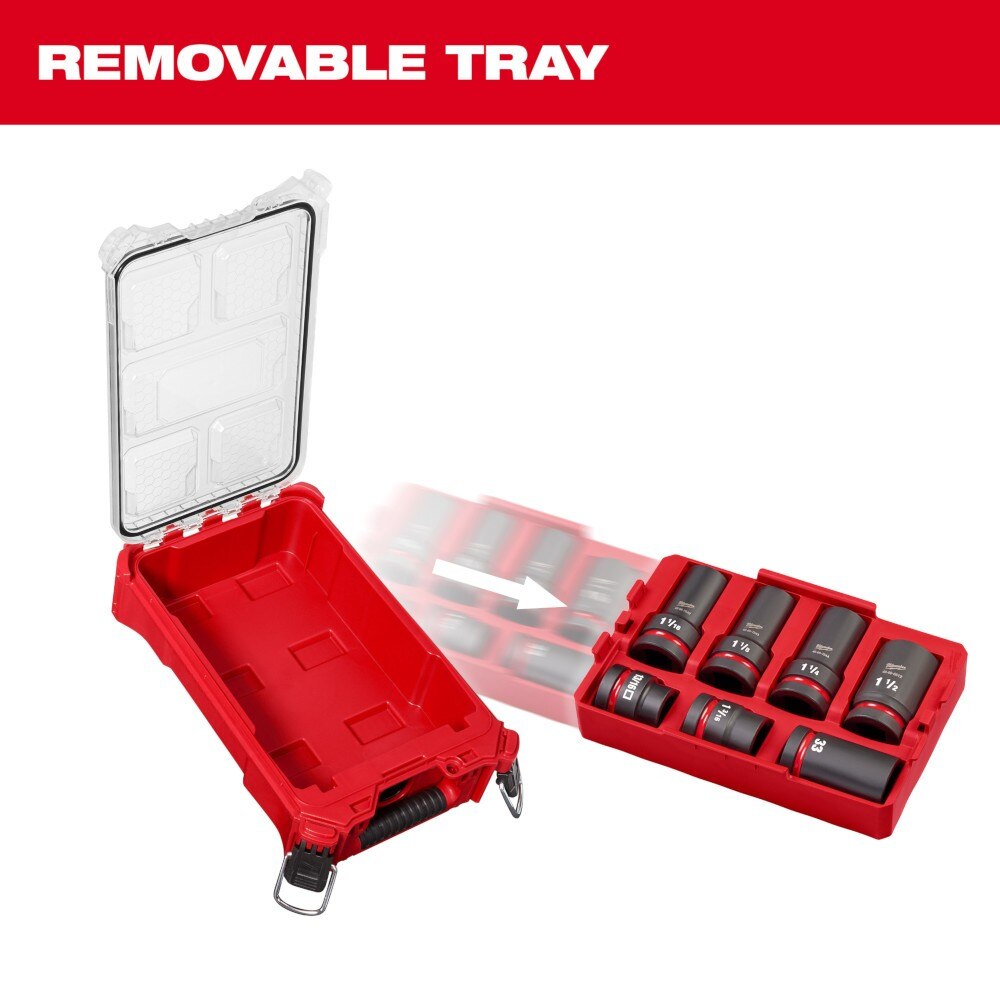 The MILWAUKEE SHOCKWAVE Impact Duty 1" Drive 7PC MM & SAE Wheel Service Socket PACKOUT Set features the boldest, longest-lasting markings. The stamped and ink-filled size markings enable you to select the right socket every time throughout the life of the socket. The 4 and 6-point metric and SAE sockets are engineered with high-strength forged steel for optimized performance in high stress applications, and a non-slip hex geometry prevents fastener rounding. The dual-hole design and ring groove allow for easy socket attachment and removal. The set is organized in a PACKOUT Compact Organizer with a clear top to identify parts at a glance easily. The Compact Organizer is part of the MILWAUKEE PACKOUT Modular Storage System, allowing for storage customization and easy transport of tools and accessories. All MILWAUKEE SHOCKWAVE Impact Duty Sockets are backed by their Lifetime Guarantee and meet ASME industry standards.