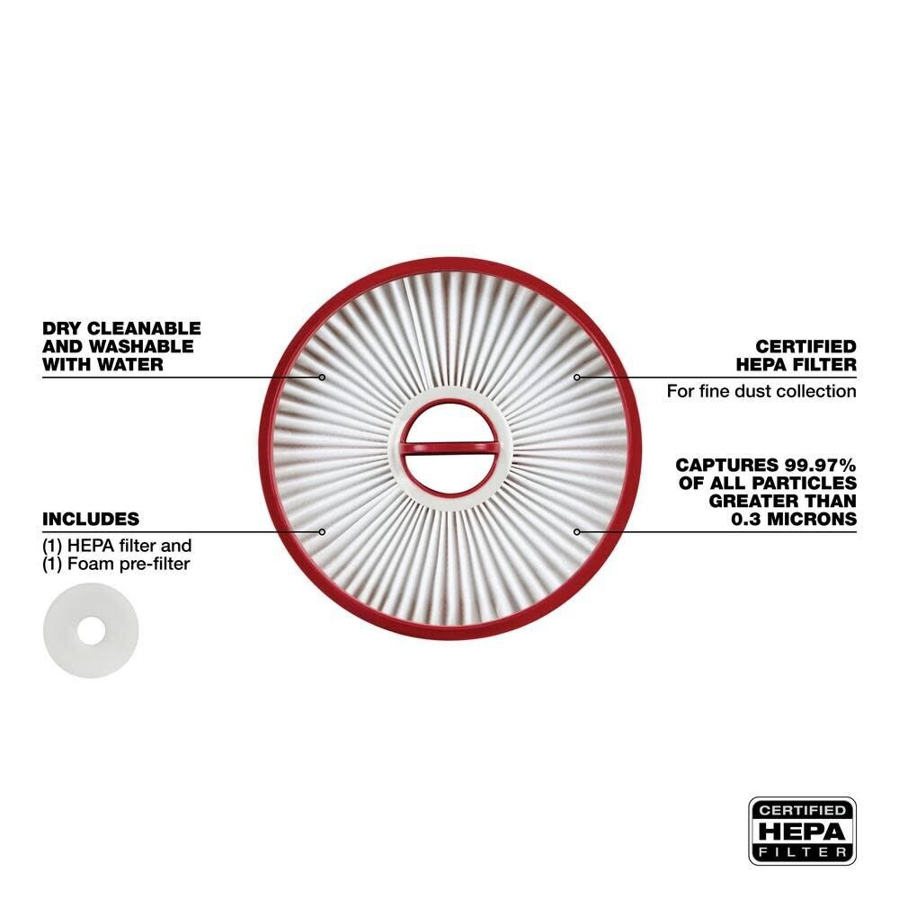 The MILWAUKEE HEPA Filter is compatible with the M18 FUEL Compact Vacuum (0940-20). This Certified HEPA filter is easy to install and captures 99.97% of all particles greater than 0.3 microns for fine dust collection. This product contains one HEPA Filter and one foam pre-filter, which are both washable and are designed to be used together on the M18 FUEL Compact Vacuum for optimal performance.