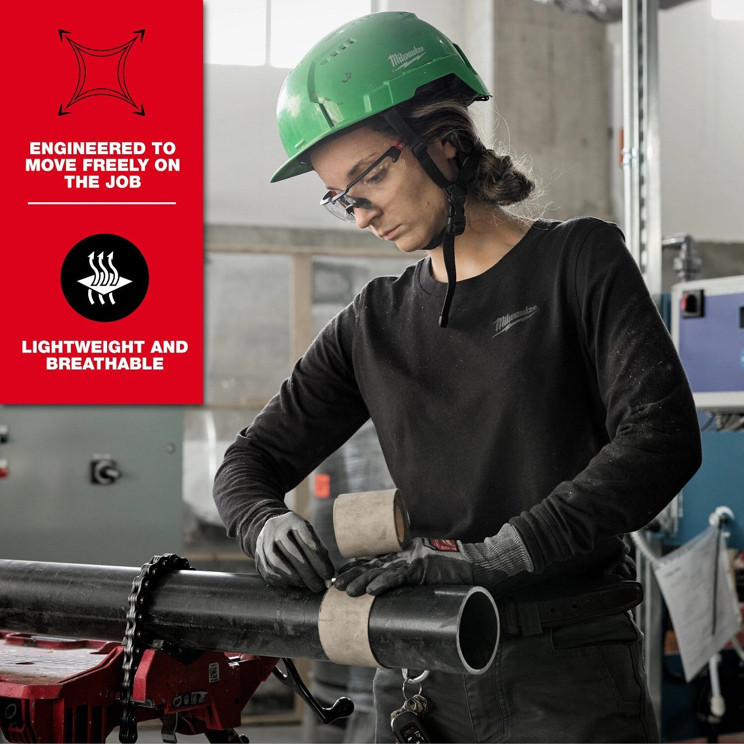 Part of the Milwaukee FREEFLEX Collection, the Women’s Long Sleeve Hybrid Tee is BUILT FOR MOVEMENT so tradeswomen can work and layer easily. The Long Sleeve FREEFLEX Hybrid Tee is engineered for mobility with natural stretch and a forward shoulder design while not sacrificing durability. Complete with moisture-wicking technology, the breathable cotton/poly blend keeps you comfortable while working. Milwaukee FREEFLEX products are developed in collaboration with feedback from users across the trades through continuous job site research.