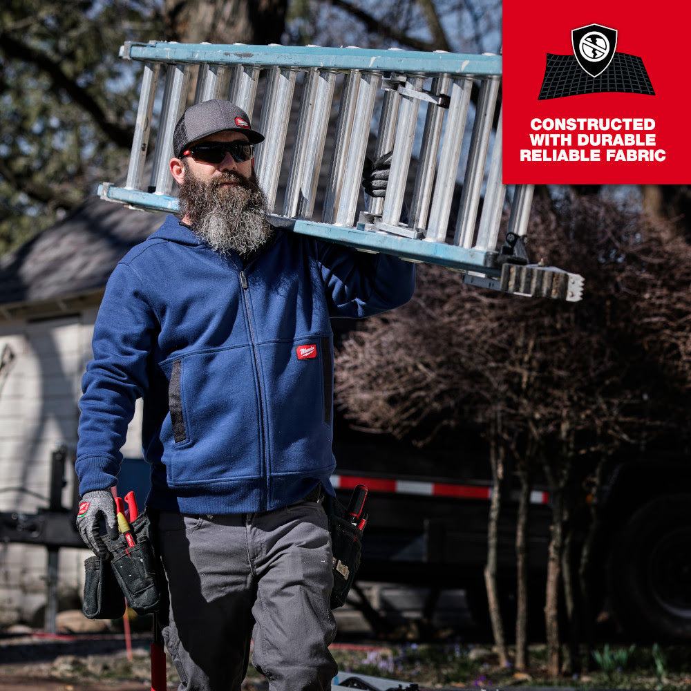 Part of the MILWAUKEE GRIDIRON Collection, the GRIDIRON Full-Zip Hoodie is BUILT TO SURVIVE. Constructed with a tear and abrasion-resistant, cotton/polyester blend, this full-zip hoodie allows you to work hard without compromising comfort. The 400GSM, heavyweight fabric ensures superior warmth whether worn as a mid-layer or robust exterior layer. Its large, reinforced pockets protect high wear and tear zones to ensure your hoodie outlives the job. The Milwaukee GRIDIRON products are developed in collaboration with feedback from users across the trades through continuous jobsite research.
