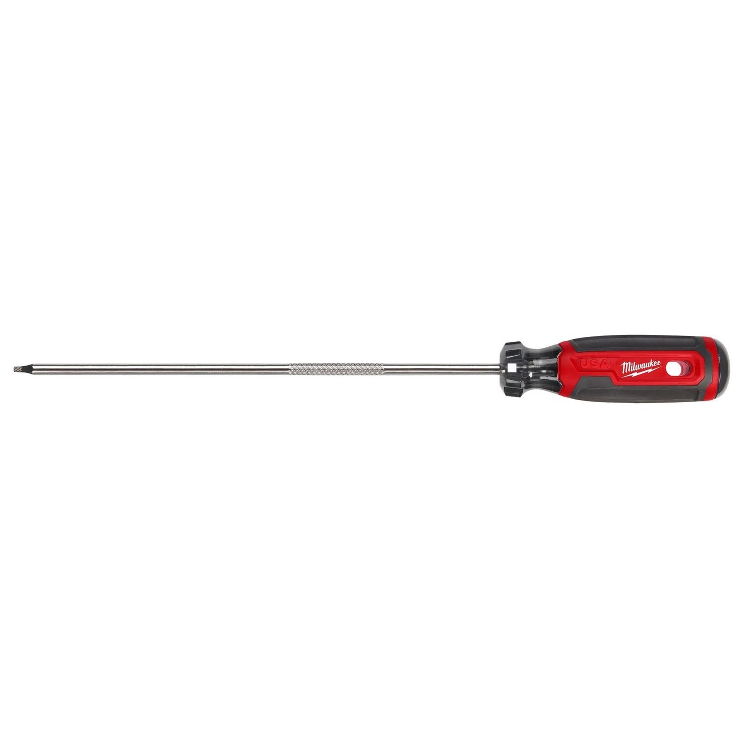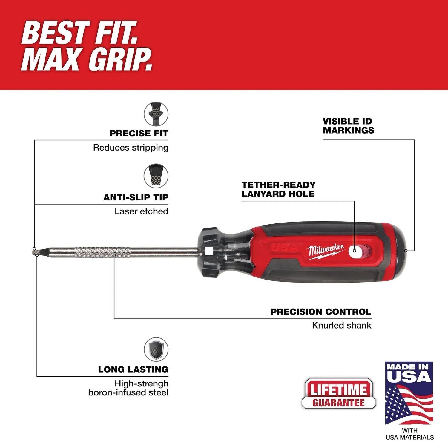 The Milwaukee Cushion Grip Screwdrivers (USA) are built to deliver a precise tip fit and maximum grip for demanding fastening applications. Custom-machined, laser-etched tips help reduce stripping, while high-strength boron-infused steel provides durability on the jobsite. Quick ID markings make it easy to identify tip size and type, and the USA-sourced materials and manufacturing are backed by a lifetime guarantee.