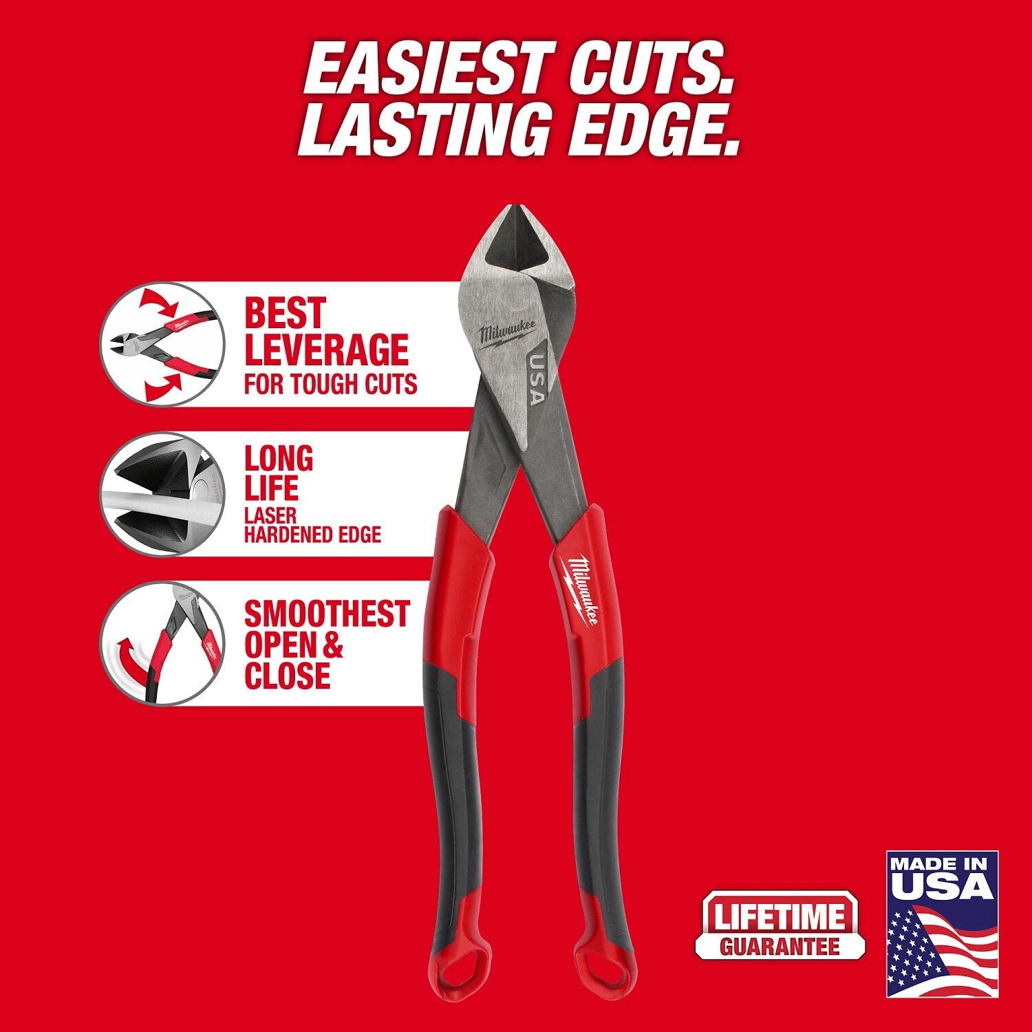 The MILWAUKEE Diagonal Cutting Pliers (USA) deliver the easiest cuts and a lasting edge for the professional user. Our pliers are designed with an optimized pivot point to provide the best leverage for tough cuts through materials like wires, screws, and other standard hardware. Our diagonal cutting pliers deliver the confidence of an extended cut life with a laser-hardened edge. Our diagonal cutting pliers are engineered to provide the smoothest open and close experience from the start, with no break-in period required. The pliers are tether-ready and offered in both dipped grip with a split-ring hole and comfort grip with a lanyard hole. Our Diagonal Cutting Pliers are available in sizes of 6-inch, 7-inch, and 8-inch. The 8" Diagonal Pliers are also available as an Angled Head, aiding access, hand clearance, and prying. Our Milwaukee Diagonal Cutting Pliers are made in the USA with best-in-class manufacturing technology and USA-sourced materials, including durable, press-forged steel, and are backed by a complete Lifetime Guarantee.