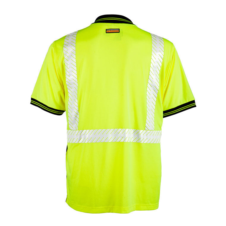 Smooth polyester material on front with micro sport mesh on back. 3 button closure. Left chest pocket. Black sides provide visual contrast. 2" wide high performance breathable reflective material. Lower inside microfiber patch for cleaning safety glasses. UPF rated, extremely lightweight with exceptional breathability. Black ribbed knit collar and sleeve cuffing with 2 lime stripes.