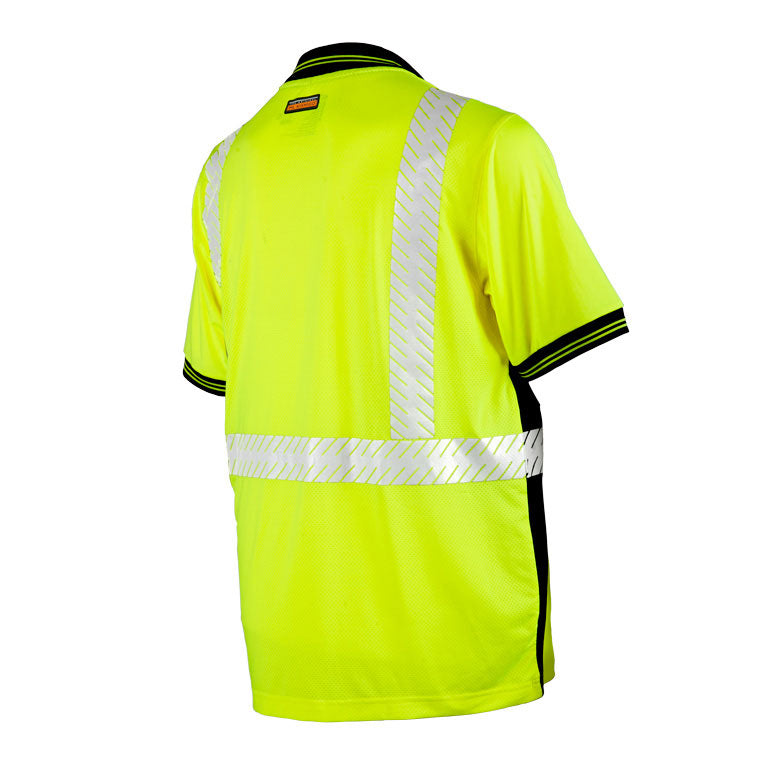 Smooth polyester material on front with micro sport mesh on back. 3 button closure. Left chest pocket. Black sides provide visual contrast. 2" wide high performance breathable reflective material. Lower inside microfiber patch for cleaning safety glasses. UPF rated, extremely lightweight with exceptional breathability. Black ribbed knit collar and sleeve cuffing with 2 lime stripes.